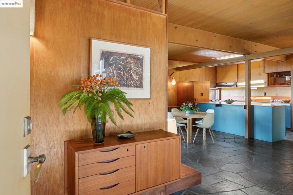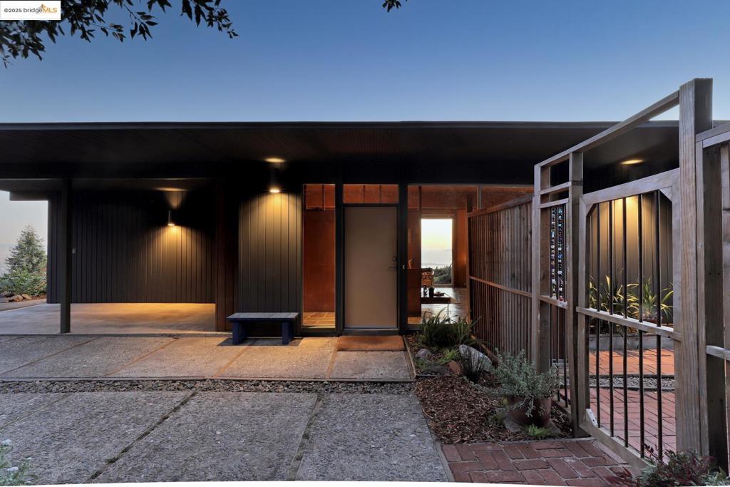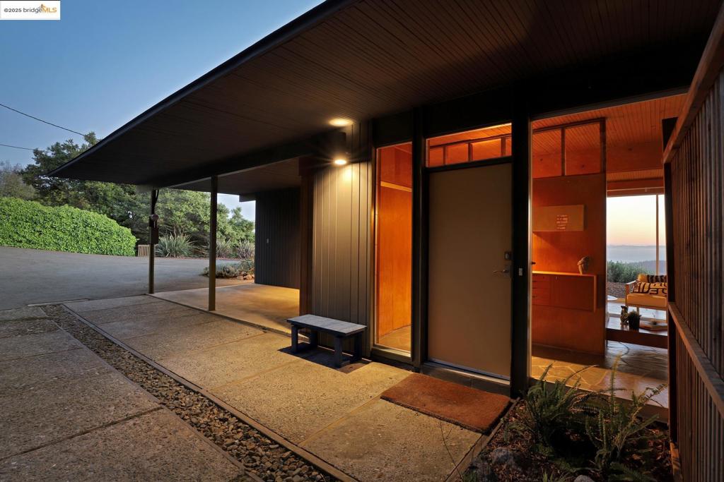Discover this rare Mid-century modern jewel with breathtaking panoramic Bay views from its coveted location in the Maybeck Estates of the Kensington hills. Tucked away at the end of a private road, this architectural treasure rests on an expansive, over half-acre, lot surrounded by tranquility. This single-level home is a celebration of its original design, offering a quintessential California indoor-outdoor living experience. Each room features dramatic floor-to-ceiling glass doors, seamlessly connecting the interior to natural surroundings. The home is a showcase of authentic architectural elements, including wood-paneled walls, exposed wood-beamed ceilings, and gorgeous slate floors, all contributing to its unique character and charm. The heart of the home is the open living room, anchored by a striking fireplace that provides a focal point for relaxation and entertaining. This dramatic feature is complemented by the vibrant orange kitchen counters, creating a visually captivating space. Down the hallway, both the primary bedroom and the generously sized second bedroom, offer comfortable and private retreats. An attached bonus room with separate entrance is ideal for office/guest room. Don’t miss your chance to experience the magic of this remarkable home.