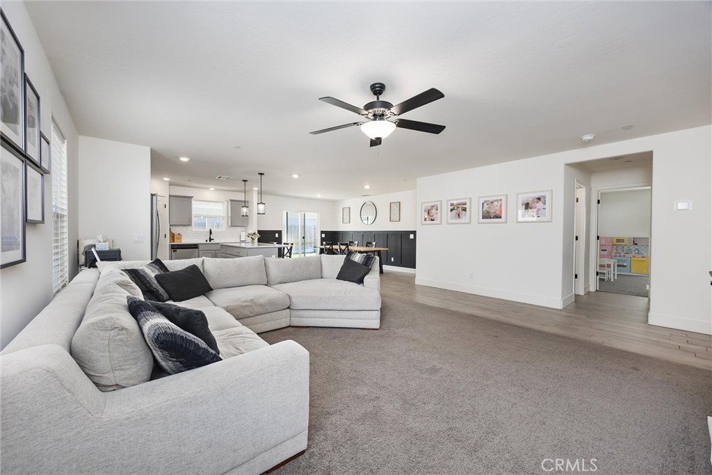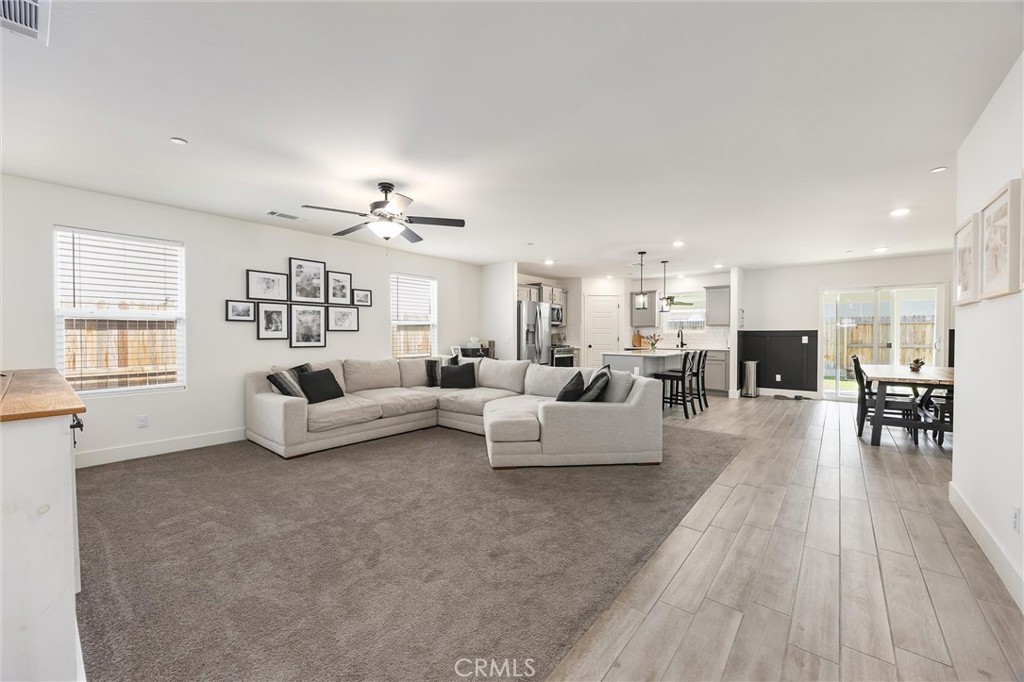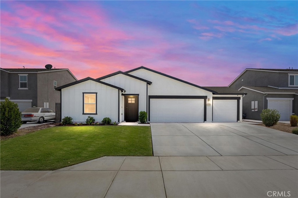 Welcome to your move-in ready 4B/3B, 1,884 sq. ft. split-wing home! Offering the huge benefit of paid solar and quick access to Hwy 99, this property combines efficiency with convenience. Located within walking or biking distance to a coffee shop, sandwich spot, and future eateries, it’s perfectly positioned for comfort and lifestyle. Inside, the kitchen shines with crisp white quartz countertops, cabinetry in a sophisticated hue, and a farmhouse sink, all flowing into a dining area accented by sleek black wainscoting. Two bedrooms share an adjoining well-designed bath with dual sinks, while wood-look flooring adds warmth and style to the kitchen and hallways. The split-wing layout ensures privacy for the primary suite, creating a welcoming retreat. Outdoors, enjoy a covered patio with dual fans and neatly landscaped surroundings—perfect for relaxing or entertaining. A 3-car garage provides added storage and functionality, making this home truly move-in ready!