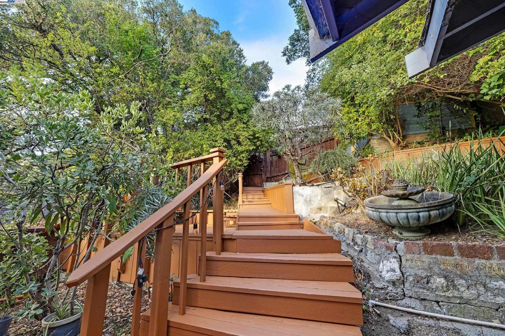 Magical Glenview Tree House! On the historic “Glendora Path” featured in the classic book ‘Secret Stairs: East Bay..” For those who love to walk and be amongst nature. Access via stairway up from Elbert St. or the Glendora pathway from Glendora Ave. Upon arrival the reward is views, privacy and natural light. Two bedroom/flex spaces upstairs as well as the kitchen, fire insert for heating and one bathroom. Large bedroom suite downstairs with full bathroom. Lovingly re-imagined by the owners with painstaking attention to the period details including restored windows, dining room with wainscoting and built-in breakfront with stained glass, doors with decorative hinges and door handles, in addition four rooms have picture molding and are internally wired for sound, surround sound in the living room and controlled sound in the kitchen. Skylights and stainless steel appliances, with restored maple cabinetry highlight the kitchen as well. The dining + living rooms have coffered ceilings & the wood floors are newly refinished. Lots of storage space; detached cottage can serve as office and subfloor access/boiler room has new energy efficient furnace and water heater. Lush outdoor spaces for gardening with rebuilt deck.