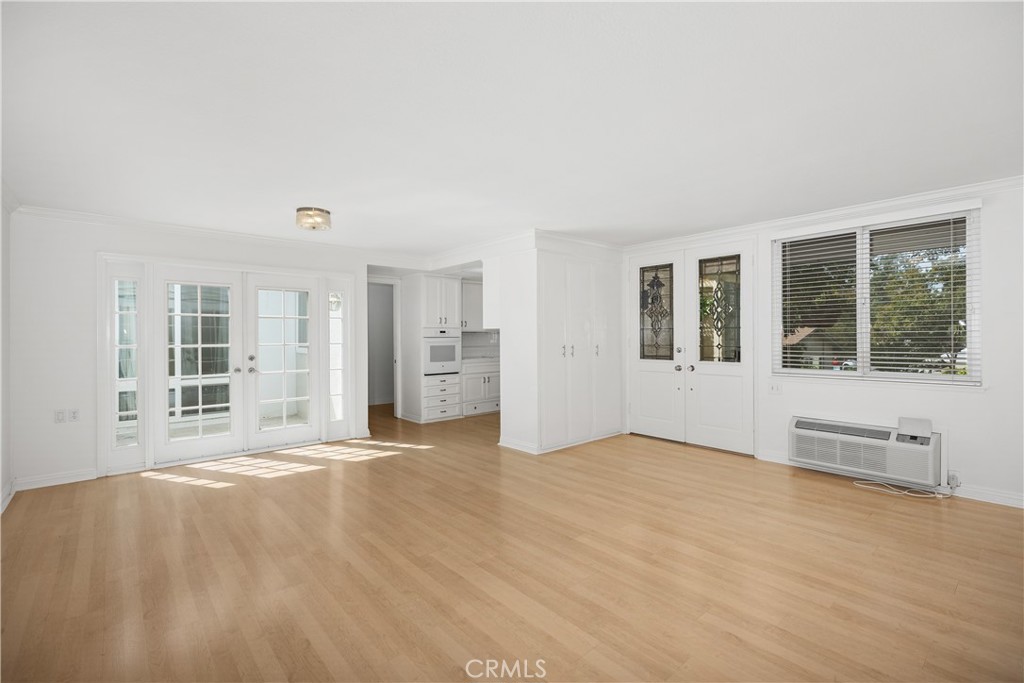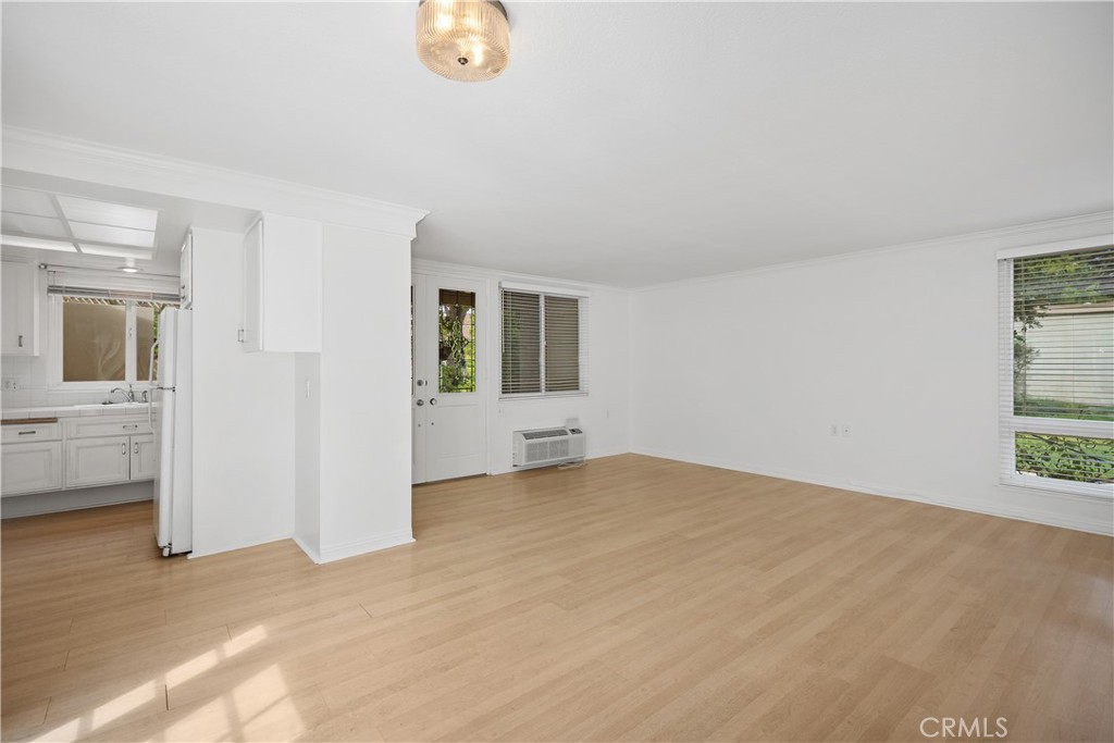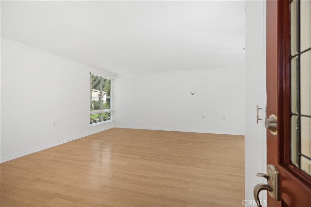 Sun-splashed Barcelona end unit with leafy outlooks, a private atrium, and in-unit laundry. Tucked along meandering walkways and mature trees, this single-level home welcomes with breeze-block detail, double glass entry doors, and a gated front patio. Inside, light laminate flooring and a neutral palette set an easy backdrop; the living and dining rooms center on the interior atrium for soft natural light and effortless indoor-outdoor flow. The bright kitchen offers crisp white cabinetry, extensive tile counters, a wall oven with electric cooktop, dishwasher, and a window to the atrium. A second private patio is shaded by a lattice cover and a small tree and includes one large closet that houses a stacked washer and dryer. Both bedrooms are well-proportioned with mirrored wardrobe doors and overhead cabinets. The spacious bath features two separate vanity areas, a tub/shower with grab bars, and a skylight/solar tube. Additional exterior storage is located off the front walkway. Move in now, enjoy as is, or update to taste while you savor the peace, privacy, and greenbelt ambiance. Laguna Woods Village offers resort-style amenities including multiple clubhouses, pools and fitness centers, tennis and pickleball courts, golf, an equestrian center, arts and hobby studios, a performing arts theater, community garden centers, an internal bus system, 24-hour security, and a full calendar of clubs and activities. Carport 109-02.