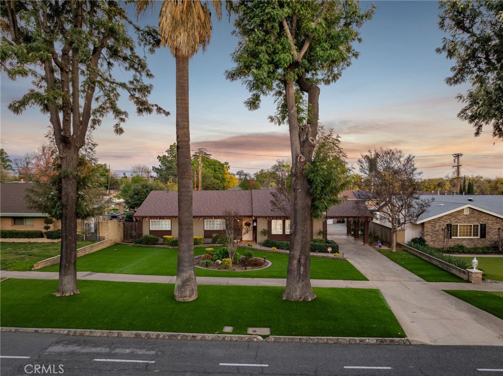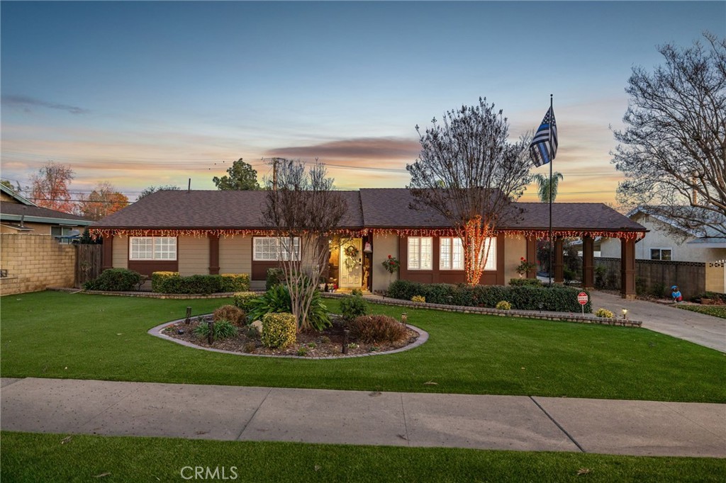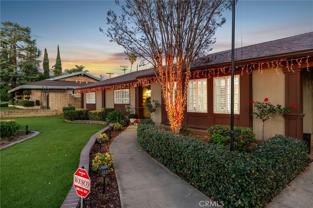 Beautifully remodeled single-story residence on iconic Euclid Avenue, featuring paid solar and exceptional curb appeal. The meticulously landscaped front yard showcases brand-new artificial turf, illuminated planters, a covered pull-through drive leading to a private motor court and attached two-car garage, and a welcoming covered front porch. The home opens to a travertine-tiled entry and front living room with vaulted ceilings, recessed lighting, LVP flooring, plantation shutters, and an open connection to the family room. The family room offers travertine flooring, recessed lighting, a fireplace with mantel, and seamless flow into the kitchen. The kitchen features custom wood cabinetry with glass upper displays, granite countertops, stainless steel appliances, a walk-in pantry, and a peninsula with countertop seating and pendant lighting. Just steps away, the spacious dining room is highlighted by a wall of windows overlooking the backyard. An oversized laundry/mudroom provides abundant storage, natural light, and French doors leading outdoors. Down the extra-wide hallway, the primary suite is accessed through double entry doors and features wood-patterned tile flooring, recessed lighting, crown molding, plantation shutters, and French doors opening to the backyard. The spa-inspired primary bathroom offers dual sinks, a soaking tub beneath a chandelier, a dramatic full-height tiled accent wall that flows into a custom shower with frameless glass enclosure and dual shower heads, and a large walk-in closet with built-in organizers. Three additional bedrooms, all with crown molding, are served by a completely remodeled hall bathroom featuring dual sinks, a custom-tiled shower with frameless glass enclosure, and a freestanding tub. The attached garage is fully finished and includes flush-mount lighting, an EV charger, and attic access with pull-down ladder and overhead storage. The backyard is designed with brand-new artificial turf, stacked-stone perimeter walls, custom lighting, a built-in barbecue, an above-ground spa, and a garden area with mature fruit trees. A cul-de-sac alley provides access to an automatic gate leading to a spacious RV parking area with two storage sheds, separated from the main yard by vinyl fencing and a gated entry. Additional features include a new roof (May 2025), dual HVAC systems, tankless water heater installed in the attic, 200-amp electrical panel, alarm system, automatic sprinklers, and Ring doorbell.