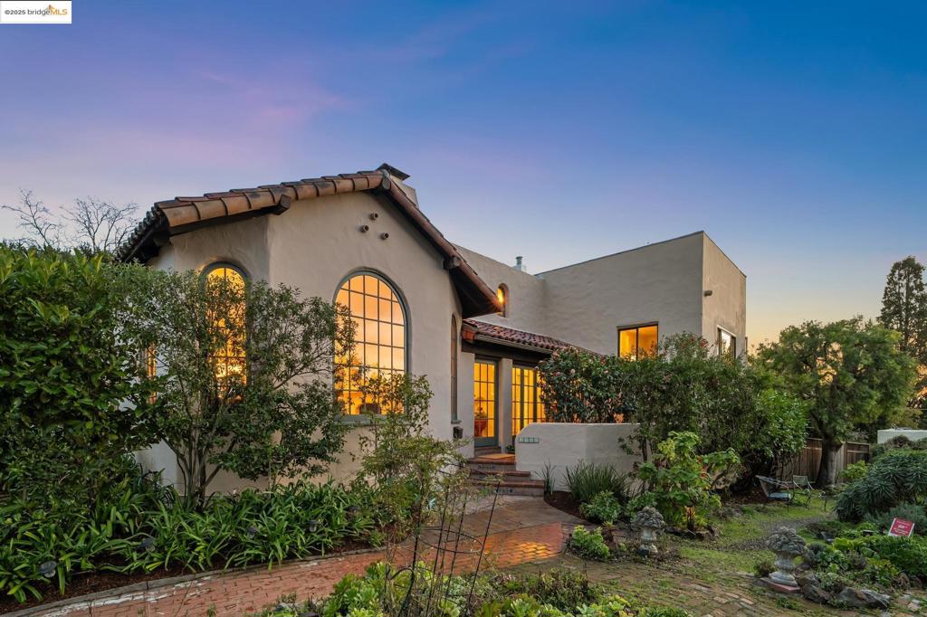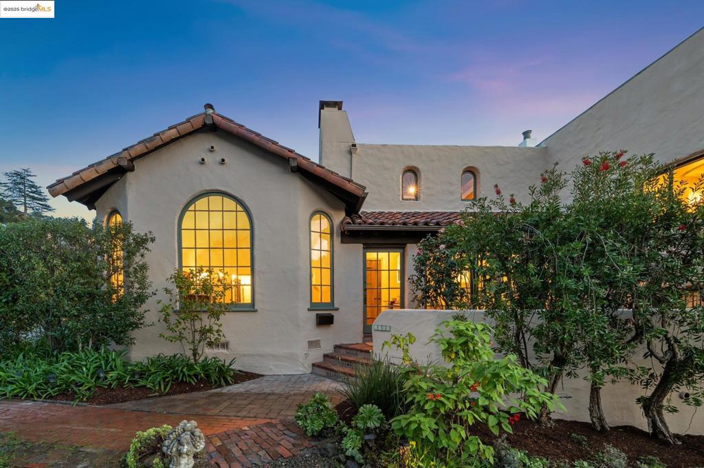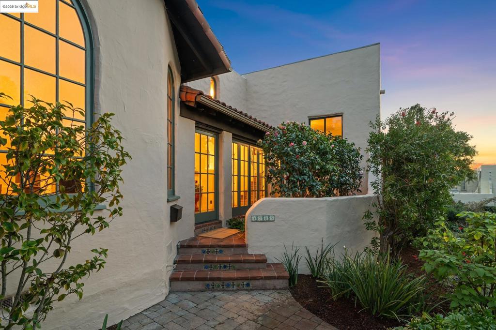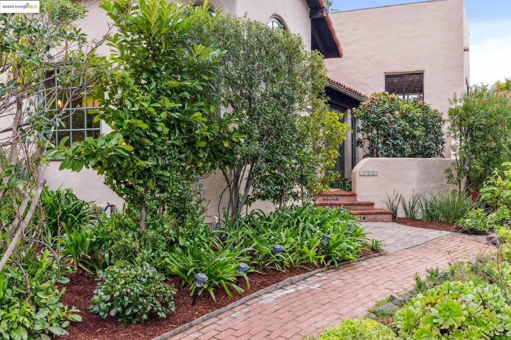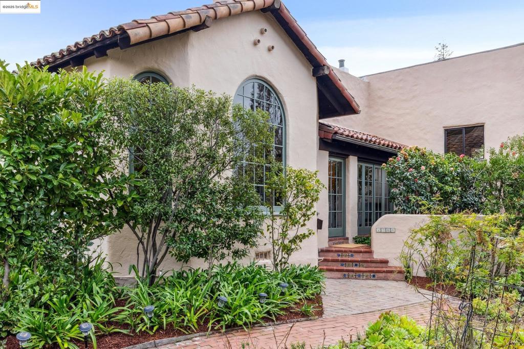 California flora & Spanish Revival charm meet in a lush private setting near the beloved Berkeley Rose Garden & Codornices Park. Refreshed 1920s home offers sun-lit interiors, updated kitchen & bathrooms, w/ rich character details, like exposed wood beams, oversized arched windows, hand-applied textured plaster, original lighting fixtures, built-ins & wood-burning fireplace- while overlooking tranquil gardens & surrounding Berkeley Hills. Updated kitchen balances contemporary elements—quartz countertops, tiled backsplash, newer cabinetry & SS appliances—w/ historic elements. Laundry room adds convenience w/ a folding counter, stacked washer/dryer, exterior access & a kitty cubby. 2 bedrooms & a bathroom reside up a half-flight of stairs. Primary suite w/ dual closets, & stunning Golden Gate views. 3rd upper-level bedroom w/ a brick fireplace, private balcony, exposed beam ceilings, built-in storage, & peekaboo Bay views. Flexible 4th bedroom downstairs for office, guest suite, or creative space—complete w/ built-in shelving & storage. French doors open to sun-drenched patio, espalier fruit trees & mature plantings. Soak up these serene views & wonder of private patios, balconies & tucked-away gardens, with easy access to renowned Rose Garden, UC Berkeley, & the Gourmet Ghetto.