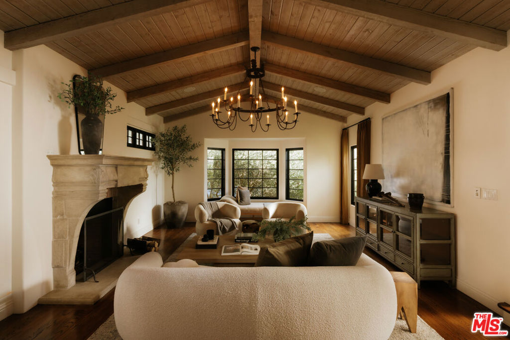 Spanish-style 1930s Hollywood hideaway on lower Queens Road, offering exceptional privacy with celebrity pedigree. Meticulously restored residence with vaulted living room and fireplace, formal dining room, and library/media room with custom cabinetry. Chef’s kitchen features marble countertops, hand-painted tile backsplash, Viking ovens, and Sub-Zero refrigerator. Reading room leads to the primary suite with Juliet balcony, fireplace, and spa-like bathroom. The guest bedroom with its ensuite bathroom, located on the main level, is a quiet haven with garden views. The expansive, flat backyard is perfect for entertaining, featuring a large pool, integrated spa, built-in BBQ, and multiple seating areas. Lush, layered landscaping with citrus, olive, and palm trees creates a serene and private Spanish-inspired oasis. A separate pool-level guesthouse with bedroom, full bath, and kitchen creates an intimate, private hideaway.