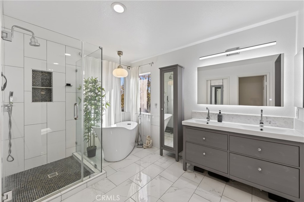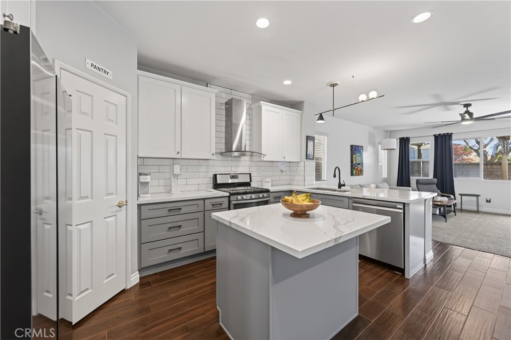 Welcome to this perfectly remodeled, move-in-ready home nestled in the highly desirable master-planned community Villages of Avalon. Just minutes from Lake Perris, this stunning residence offers 3 bedrooms and 2.5 bathrooms with a spacious open-concept layout on the main floor. Step inside and experience a home that has been thoughtfully updated throughout. The completely renovated kitchen features brand-new cabinets, countertops, backsplash, appliances, and a peninsula that overlooks the family room, making it ideal for everyday living and entertaining. A seamless flow from the kitchen to the dining area and welcoming family room. Enjoy cozy evenings in the spacious living room with its own fireplace, perfect for cool winter nights. Upstairs, all bedrooms are generously sized, including an impressive primary suite that showcases a luxurious, fully remodeled bathroom. This spa-like retreat offers a modern freestanding soaking tub framed by natural light, a large walk-in glass shower with contemporary tile work and a beautifully updated double vanity with sleek finishes. The hall bathroom has also been fully updated and features a modern walk-in shower with glass doors and white tile, along with black fixtures and an upgraded vanity that gives the space a clean, contemporary feel. The upstairs laundry room is conveniently located near all bedrooms. Residents of The Villages of Avalon enjoy access to exceptional community amenities including a recreation room, sparkling pool, picnic areas, and BBQ spaces. The home is close to schools, parks, shopping, dining, the Lake Perris Fairgrounds, motorsport activities, hiking and biking trails, and is just minutes from the 215 freeway. This home is truly move-in ready with every major upgrade already completed for you. Simply unpack and enjoy.