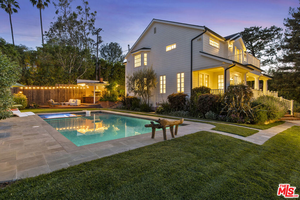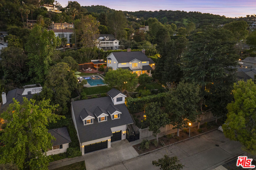 Dramatically sited south of the boulevard atop a double sized flat lot and set among tall trees on its own knoll, this extraordinary one-of-a-kind colonial estate with ADU offers resort like indoor-outdoor compound living, unique sweeping tree-top and mountain views and unparalleled privacy in the heart of Sherman Oaks. The huge stone walls and 3 car garage at street level belie a vast lush professionally landscaped secluded yard above, with a new elevator transporting you from street level right up to the sprawling yard and imposing east-coast style mansion. Columns and a shady front porch give way to a central formal foyer leading to spectacular living room with fireplace and massive French doors. Formal dining room with French doors opens to chef’s kitchen and massive great room with center island, marble counters, an assemblage of stainless appliances plus built-in window seating and fireplace. Also located on the first floor is a spacious full guest wing with its own private entrance and terrace, plus a fifth/bedroom or study. Ascend the grand staircase with soaring vaulted ceiling to the huge primary suite with dual walk-in closets and deluxe en suite with separate tub and shower. Two additional spacious guest bedrooms share a second bathroom upstairs with built-ins and large walk-in closets. Newly installed wide plank wood floors, custom lighting, built-ins and soaring ceilings throughout. All rooms on the main floor lead outside to the stunning massive yard designed and created by current owners: featuring hotel like amenities including newer swimmers pool with spa and Baja shelf; Canadian pure cedar sauna; outdoor private shower; cold plunge; changing rooms; vegetable garden; over a dozen varieties of fruit trees; trampoline; play house, and top of the line outdoor kitchen with open fire grill, smoker and gas grill–plus bar seating. The separate ADU with its own address feels like its own residence with streams of sunlight, stainless mini kitchen and newly tiled bath. Additional upgrades by current owners include: completion and redesign of chic ADU; new roofs; completely new drainage system; plus plumbing, electrical and HVAC upgrades. Enjoy the comfort and privacy of your own compound with the exhilaration of knowing iconic restaurants and shops are just a short walk away.