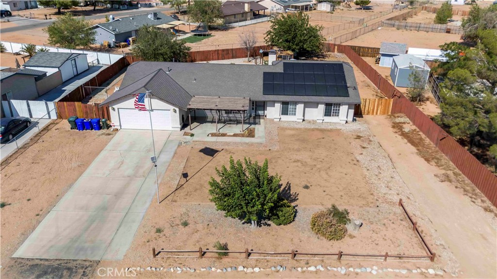 Wow! What a deal! Welcome to this beautifully upgraded, move-in ready single story home located in a quiet, well established neighborhood in Apple Valley. This spacious home offers 3 bedrooms, 2 bathrooms, and 1756 sq. ft. of living space, perfect for comfortable everyday living. Enjoy all new flooring throughout the entire home, fresh interior paint, and a brand new roof for peace of mind. Huge bonus is the energy efficient solar system to eliminate your monthly Edison bill. The inviting kitchen features ample cabinetry, a pantry, tile countertops, a breakfast bar, and a cozy dining nook. The family room includes a charming brick fireplace and opens to the dining area with sliding glass doors that lead to a covered patio, ideal for relaxing or entertaining. The large primary suite offers a double sink vanity, a soaking tub, separate shower, and a walk in closet. The home also features an indoor laundry room with a gas dryer hookup, an attached 2 car garage, RV parking, a fully fenced back yard, and a storage shed. Conveniently located near shopping centers, schools, parks, and restaurants. This is a must see home that offers comfort, convenience and style in one turnkey package now offered at an unbeatable discount!