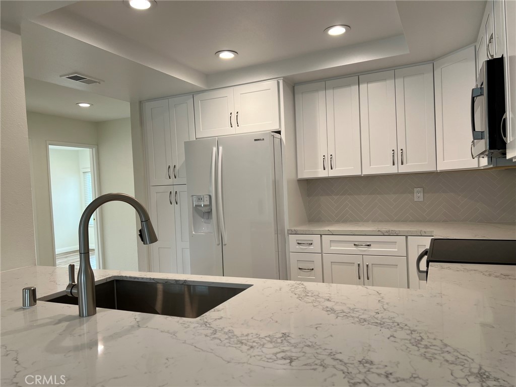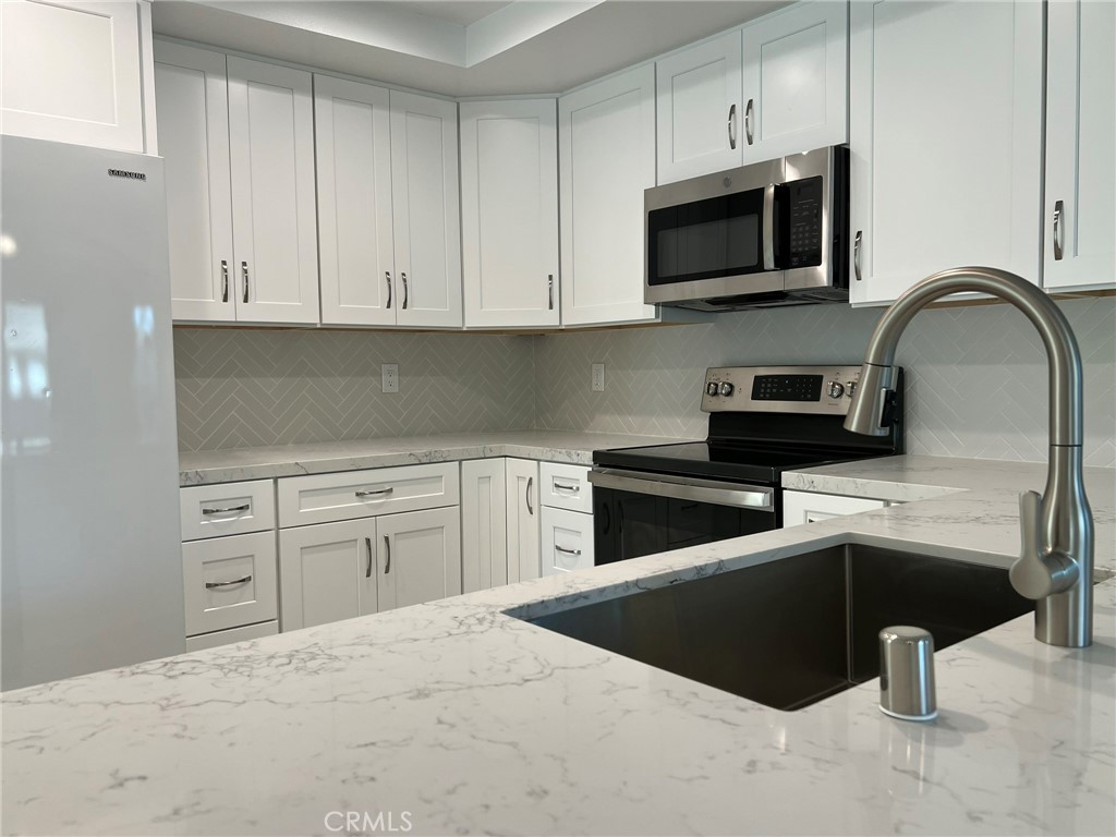 Beautifully renovated single-story 3-bedroom, 2-bath corner unit townhome in the desirable Sundance community. The brand-new kitchen features white cabinetry, quartz countertops, herringbone backsplash, eat-in counter, stainless steel tub sink, and stainless steel appliances. The vaulted, open-concept living room feels light and expansive, highlighted by abundant natural light. The dining area opens to a private patio, ideal for morning coffee or entertaining. All bedrooms are generously sized with natural light, recessed lighting, and mirrored closet doors. The bathrooms offer a resort-style feel, from the primary en-suite with glass shower enclosure to the hallway tub, each fully remodeled with new tile, quartz countertops, soft-close vanity drawers, accent lighting, updated fixtures, fans, toilets, and flooring. Additional upgrades include triple-pane windows for enhanced quiet and energy efficiency, central air and heat, recessed lighting throughout, privacy blinds, and oak-style vinyl flooring that ties the home together beautifully. This single story corner unit townhome has no neighbors above. Enjoy a 2-car attached garage with direct access, plus washer and gas dryer hookups. Conveniently located near the community lap pool and clubhouse, and close to Satellite Park featuring a playground, volleyball court, basketball court, and gazebo. Located in Cerritos, home to the acclaimed ABC Unified School District, including Whitney High School (admission by testing). Easy access to freeways, public transportation, shopping, and restaurants. No pets allowed.