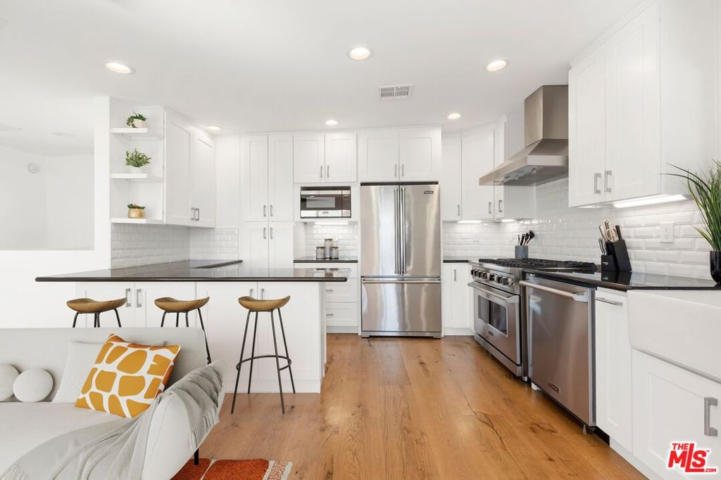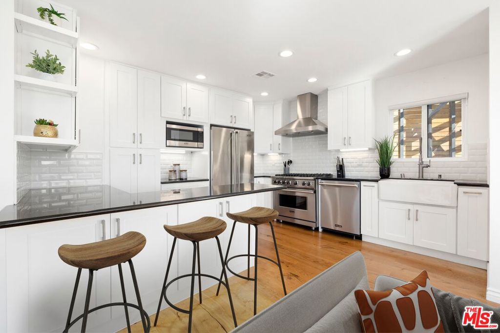 Nestled in the Hollywood Hills is this beautifully renovated Nichols Canyon-adjacent view hideaway, offering sweeping vistas of the hills, canyons, treetops, and bustling city sprawl. Large picture windows and walls of sliding glass throughout welcome natural light inside. The living room includes access to a wraparound balcony and oak floors that flow into the remodeled kitchen, appointed with a farm sink, all Viking appliances including range with hood, copious cabinetry, breakfast bar ledge, and glossy subway tile backsplash. Bedrooms are spacious and bright, and the primary also opens to the outside lounging and viewing terraces. Bathrooms are also updated and pristine, with stylish tiling, fixtures, and hardware. Entertain, barbecue, and dine al-fresco from a trellis-covered rooftop patio with privacy shade or relax under California skies with the lovely hillside as backdrop. Stackable laundry is convenient to bedrooms, and covered parking includes a carport. Welcome to this fantastic location central to all, from West Hollywood and the Sunset Strip to Hollywood, the Valley, and major film studios, mere moments to fine dining, hiking on Runyon, shopping along Melrose, thriving nightlife, and more. Some photos are virtually staged.
