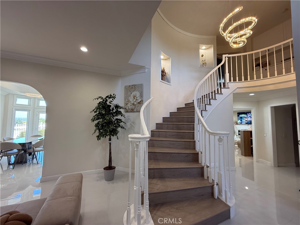 STUNNING VIEW HOME Nestled on a Hillside in a Quiet Neighborhood. This beautiful residence offers a harmonious blend of classic charm and modern updates, featuring spacious living areas throughout. The meticulously designed front entrance and extensive upgrades—inside and out—create a warm and welcoming ambiance. Upon entry, you’ll discover an open-concept living space with recessed lighting that seamlessly connects to the dining room, offering a contemporary and cozy atmosphere. The updated gourmet kitchen boasts ample cabinetry and a central island, perfect for enjoying views of the lush garden. The remodeled family room showcases a sleek modern flame fireplace and a wet bar, ideal for entertaining. The lower level includes one bedroom and a fully updated bathroom, complemented by new flooring and fresh paint throughout the home. Upstairs, you’ll find three additional bedrooms, two bathrooms, and a generous bonus room currently styled as a children’s playroom. The primary suite features a private balcony and a beautifully updated suite bathroom with a walk-in closet. Wood stairs and wood flooring throughout 2nd floor. Step outside to enjoy spectacular panoramic city lights and scenic vistas from the beautifully landscaped garden. This home is conveniently located near shopping, dining, parks, and entertainment, with easy access to the freeway.