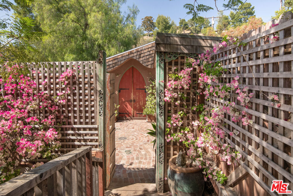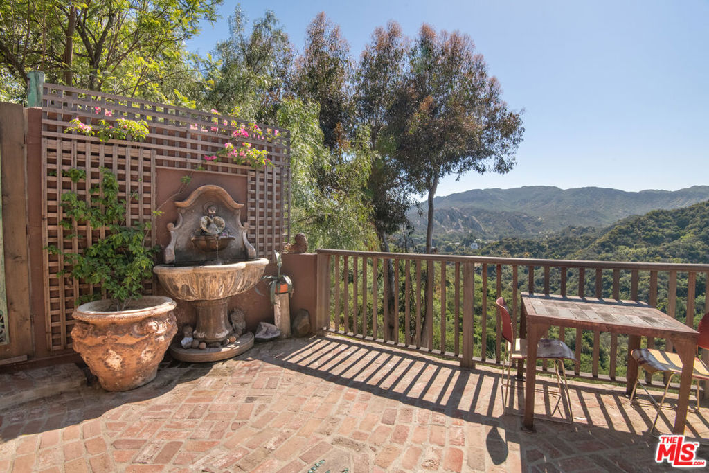 This private artistic retreat offers breathtaking mountain views and flat, usable outdoor spaces perfect for sunsets and moonsets. The approximately one-acre amphitheater-shaped parcel features tiered land, fruit trees, crystal-adorned stone steps, a flagstone area with giant heart designs, and a playground. The main entry showcases large antique arched doors leading to an interior blending antique charm and eco-conscious elements.The atrium features a handmade Elk Mountain flagstone entryway crafted with various inlaid crystals, and a reclaimed Douglas Fir mosaic ceiling painted with natural motifs by a local Topanga artist. A former photography studio has been converted into a potential bedroom, featuring vintage French doors, antique hardware, and refinished parquet floors. The guest bathroom is designed in a beautiful oceanic grotto style with a bubble skylight.The living spaces include a bright and inspiring art room, which can be opened to create a seamless flow throughout the area. The adjacent living room features expansive windows that offer stunning, unobstructed views of the mountains beyond. They both feature vintage parquet and reclaimed wormy chestnut floors. The living room boasts a sunstone fireplace and opens to a fireproof Tiger wood wrap-around deck. The kitchen features Moroccan tiled floors, reclaimed wood cabinetry, Amazon green granite counters, and antique elements, including a vintage showroom table repurposed as an island. Adjacent to the kitchen is a tranquil library with a wrap-around bookcase, vintage parquet flooring, and three large bubble skylights. The master suite includes adobe-style walls, a gas fireplace, and a cedar Japanese soaking tub on the deck. The main bathroom features a large custom soapstone tub, hard wood walls, and a two-way fireplace. A second bedroom suite off the library features curved walls and exposed beams, offering a relaxing retreat. Outside, the property includes a charming one-bedroom guest cabin with a wood-burning stove, a small loft, and full bathroom and kitchen surrounded by gardens, a fully fenced in large chicken coop, fruit trees, and a magical play area under Mother Oak. During rainfall, a waterfall cascades down the hillside behind the cabin. The property also includes an off grid 24-panel solar system for backup power.