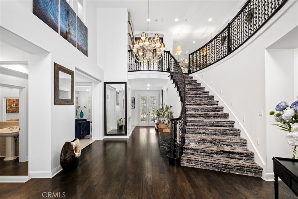 Welcome to this private Cape Cod-inspired estate in guard-gated Coto de Caza, offering panoramic east-facing views and sophisticated entertaining. Nestled at the end of a cul-de-sac, this home boasts the largest floor plan in the Southern Hills Encore Tract and a truly exceptional living experience. An expansive driveway and garage provide parking for up to eight vehicles. Inside, the soaring entry reveals sweeping wrought-iron stairs and a living room with one of three fireplaces. Four sets of French doors create a seamless transition to the backyard oasis, complete with a PebbleTec pool and spa, built-in BBQ with gas line, fire pit, and a waterfall. The outdoor space includes an outdoor shower, lighting, and surround sound that extends throughout home’s main level. Four balconies provide private vantage points for the views. Throughout the home, hardwood floors, contemporary lighting, and wood shutters add functional elegance. The gourmet kitchen is open to the family room and equipped with professional-grade WOLF/SubZero appliances, dramatic slab countertops, and abundant storage including a walk-in pantry. A formal dining room is complemented by casual eat-in space and a breakfast bar. With 5 bedrooms and 5.5 baths, including a main-level in-law suite, everyone enjoys comfort and privacy. The primary suite is a true retreat, featuring a fireplace, private balcony, and a walk-in closet with custom built-ins and attic access for additional storage. An adjoining room offers flexible space for a private gym, office, or expanded closet. The spa-like primary bath includes an oversized jacuzzi tub and a walk-in shower. The upper landing provides another versatile space for a den or office. Key upgrades include recessed lighting, Casablanca fans, dual air conditioning units, a whole house fan, and a water purification system. The property also features a large, paved side yard with a storage unit matched to the home. This property offers a complete lifestyle with access to Coto de Caza’s community amenities, including horse trails, a clubhouse, and sports facilities. The renowned Coto de Caza Golf & Racquet Club, with two championship courses designed by Robert Trent Jones Jr., is also nearby, and all is located within minutes of diverse shopping and dining options. This is Coto de Caza living at its best. —