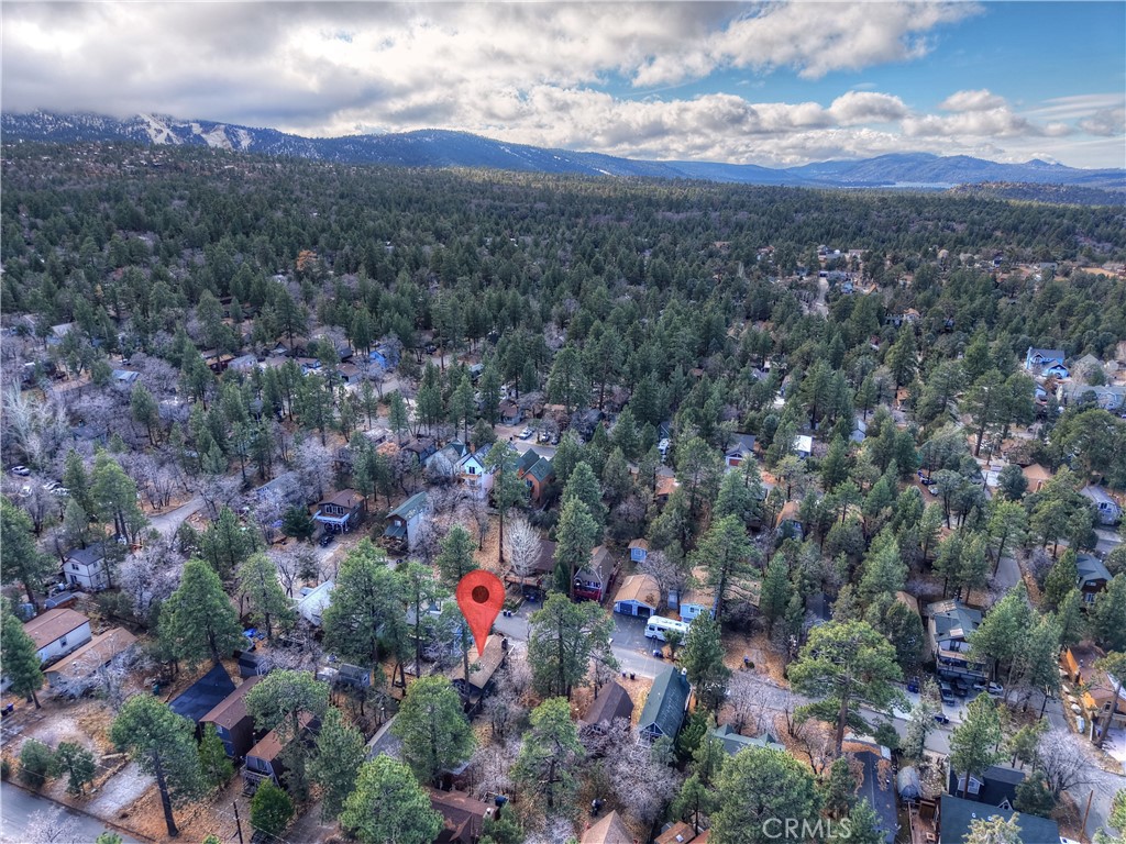 Chalet style home located in Sugarloaf ~ This reverse floor plan features 2 bedrooms and 1.5 bathrooms ~ A mud room, one bedroom, a half-bathroom with laundry hookups, and a large closet are on the entry level ~ The other bedroom with large closet is upstairs, alongside the main living area, and the full bathroom ~ The living room, kitchen, and dining area on the second level are an open space to gather, and have laminate flooring, an inviting rock fireplace, T&G ceilings, and an abundance of natural light ~ Enjoy outdoor living on two decks, with one in the front, and one in the rear with a storage area, ideal for relaxing or entertaining ~ The yard is partially fenced ~ Situated near hiking trails and the National Forest, with convenient access to Big Bear Lake, ski resorts, and local amenities.