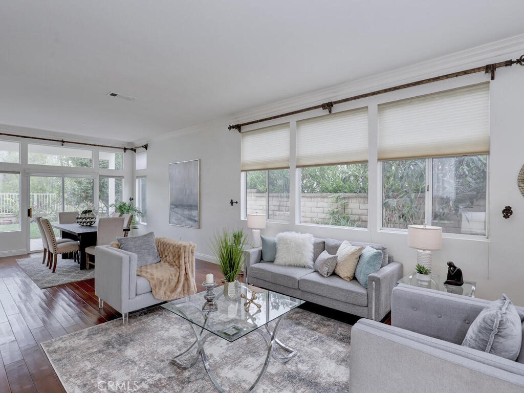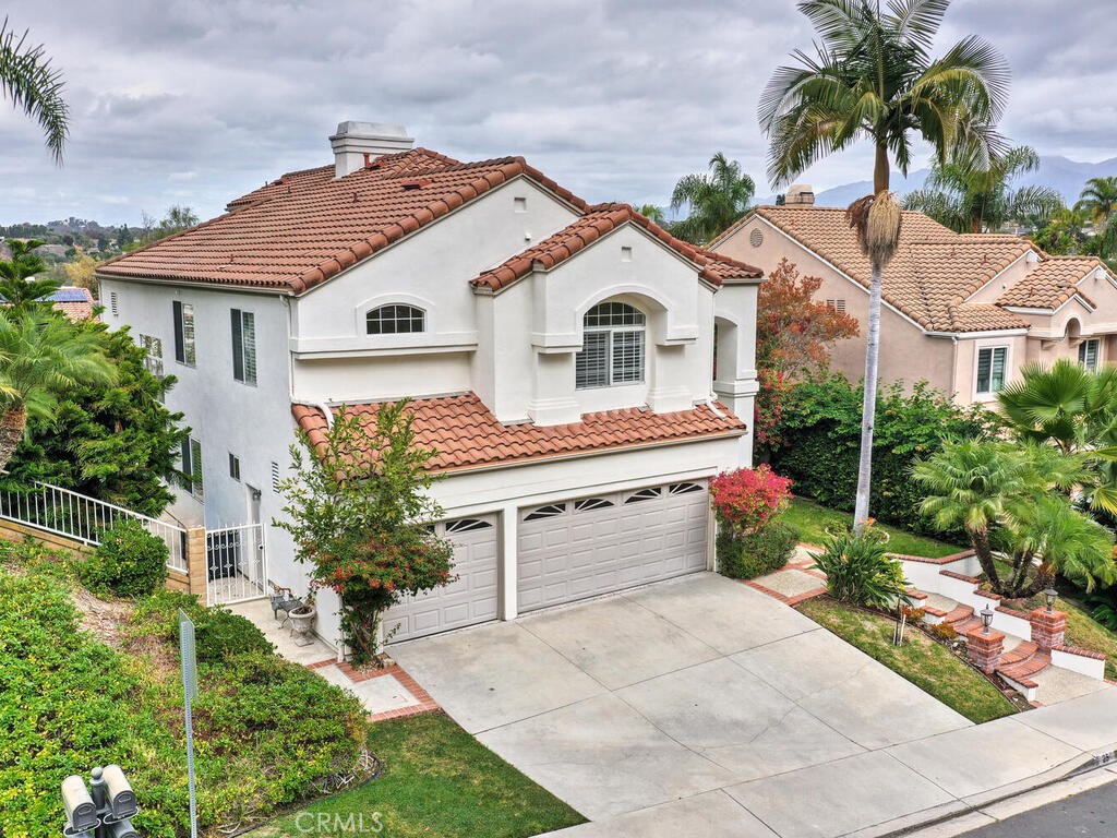 Exceptional Pacific Hills home on a large lot, ideally positioned on a single-loaded street offering greenbelt views in front and peaceful treetop vistas with peekaboo Saddleback Mountain views in back. The terraced street design provides generous side yards and comfortable spacing between homes, creating a sense of openness and privacy. This beautiful home offers a downstairs bedroom suite with private 3/4 bath. Double doors open to a grand two-story foyer! Step down to the formal living and dining rooms, filled with natural light from many large windows with views to the lush yard and greenery. The spacious kitchen opens to a large informal dining area and family room with fireplace and built-in bar, ideal for gatherings and entertaining. A peninsula provides additional seating and casual dining space. Upstairs, the expansive primary suite offers a private sitting area, view balcony, dual closets (including a walk-in), and a beautifully appointed bath with soaking tub, separate shower, and dual-sink vanity. Two additional bedrooms and a versatile loft with closet—easily convertible to a fifth bedroom—are serviced by a full hall bath with dual sinks and a tub/shower combination. Upgrades include fresh interior paint and carpet, engineered hardwood flooring, and a previously remodeled kitchen featuring upgraded cabinetry with lighted glass display shelving and granite countertops. Plantation shutters enhance select windows throughout. The backyard is a gardener’s delight, with a grassy expanse of fresh sod, mature citrus and apple trees, and many planter areas. A cement pad awaits a future fountain or custom feature, while the covered patios provide shaded areas for outdoor dining and relaxation. With plenty of room to run and play, the yard is ideal for children and pets alike. Walking distance to Newhart Middle School, the Norman P. Murray Community Center, local shopping and restaurants, and the scenic Oso Creek walking trail, residents also enjoy membership to Lake Mission Viejo, offering boating, beaches, concerts, and year-round recreation.