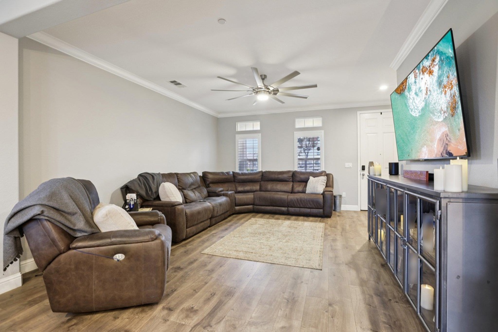 Stunning two-story home with a resort-style backyard designed for elevated living and entertaining. This maintained residence offers a bright, open layout with refined finishes and versatile spaces ideal for work-from-home, multi-generational living and RV Access. The interior features spacious bedrooms, each with its own walk-in closet, updated bathrooms with dual vanities, and a well-appointed primary suite designed as a true retreat. The owner’s bath includes an extra-large walk-in shower and elevated-height vanities for a spa-like feel. Neutral designer tones and abundant natural light create a polished, move-in-ready atmosphere. A generous upstairs loft offers flexible space for a media room or lounge, while a built-in desk with filing cabinets and shelving provides a dedicated workspace. Step into the backyard retreat, complete with a custom Trex deck with built-in lighting, a covered patio with ceiling fans, and a hot tub featuring a dramatic rock waterfall. Multiple seating and dining areas, a freestanding fire pit, raised planters, and string lighting create a private, resort-like setting ideal for entertaining. Conveniently located near parks, schools, shopping, and commuter routes. A blend of sophistication, comfort, and outdoor living best experienced in person!