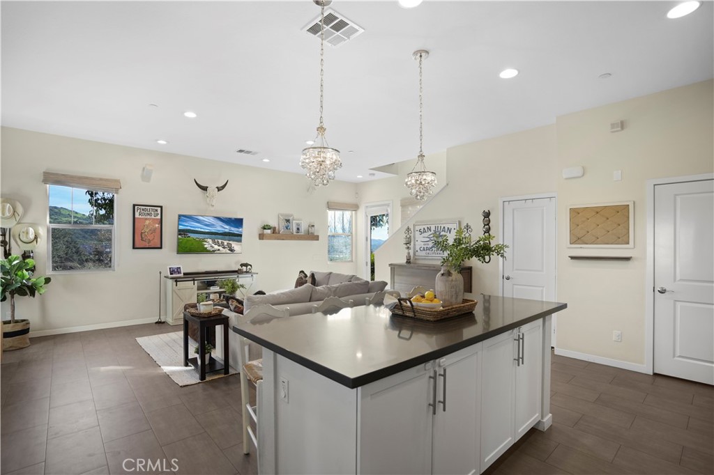 Perched on this elevated location in Sendero Lyon Cabanas, this FORMER MODEL HOME boasts panoramic views of the rolling hills, canyons and peekaboo ocean views allowing for cool breezes and gorgeous sunsets. Only attached on one wall, this 2 story property feels like a single family home. The kitchen includes gray quartz countertops and oversized island with seating for 4, white cabinetry with ample storage, glass subway tile backsplash, beautiful RH Glass pendants and stainless appliances including a 5-burner double oven range and full sized refrigerator. The adjacent great room is bathed in light from all of the windows that showcase the gorgeous view everywhere you look. Also access the large greenbelt in front of the house and take in the sunsets outside the single hung French Door just off the great room. Convenient powder bath with built-in cabinet with quartz counters completes the downstairs. This highly sought after floorplan boasts a spacious master suite with hillside and canyon views, large windows creating a light and airy feel and a large walk-in closet. An ensuite primary bath with dual sinks, quartz counters, custom backsplash and a step in tiled shower complete this primary sanctuary. The second level also features an office with wrap around built-in desk and cabinetry, generous secondary bedroom, secondary bath with quartz counter tops and tub/shower and upstairs laundry with included machines. Easy care oversized tile floors downstairs, plush carpet on the second level, recessed lighting in every room and custom woven grasscloth roman shades create a finished designer look. Attached 2 car garage with custom cabinets, built in workspace and epoxy floors round out this steal of a deal! Step onto the outdoor veranda providing plenty of space to relax, bbq or dine. Steps from the Outpost Pool with resort pool, jacuzzi spa, resort style bar, bocce courts, community clubhouse with full kitchen and BBQ patio. Live the resort lifestyle in this wonderful home with access to walking trails, 8 pools, workout gyms, arcade, firepits and more. Welcome Home!