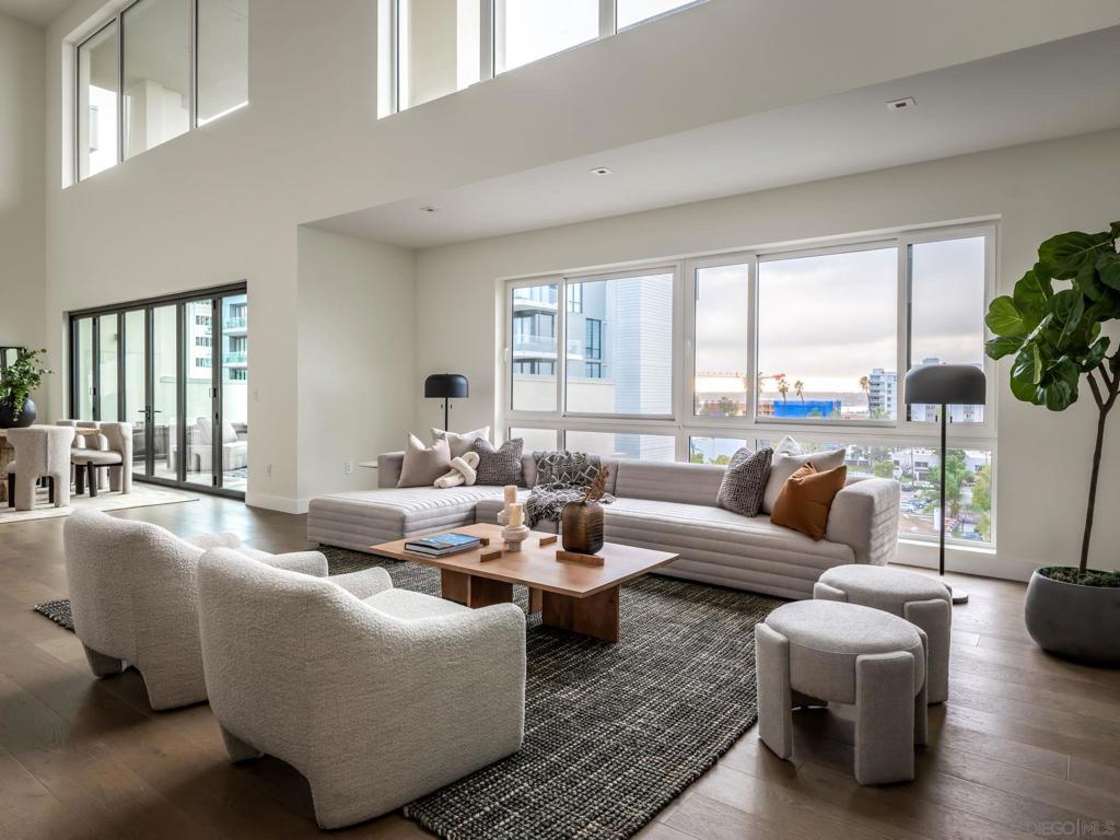 Welcome to the largest penthouse at The Vue on 5th in Bankers Hill. This is one of five exclusive top-floor units and the only one to come to market since it was originally built in 2016. The expansive double-height ceilings and west-facing exposure fill the open floor plan with natural light and offer views of the Coronado Bridge, Point Loma, harbor, sunsets, ocean, and vibrant city lights. These views can be enjoyed from the 290 sq ft deck and various interior vantage points. The property features a spacious guest bedroom on the entry level, an office, an elevated primary bedroom, and a loft with superior orientation and the potential to expand and enclose for a third bedroom. There is a tasteful allocation of space for ample closets, baths and laundry room. This is truly a remarkable home set above the rest. The Vue offers HOA fees that are far lower than those of surrounding similar buildings, along with conveniently located first-floor amenities such as Orange Theory, Pilates, cold plunge, and infrared sauna treatments. All of this is just steps away from Balboa Park and the destination lifestyle of Bankers Hill. See Document section for floor plans.