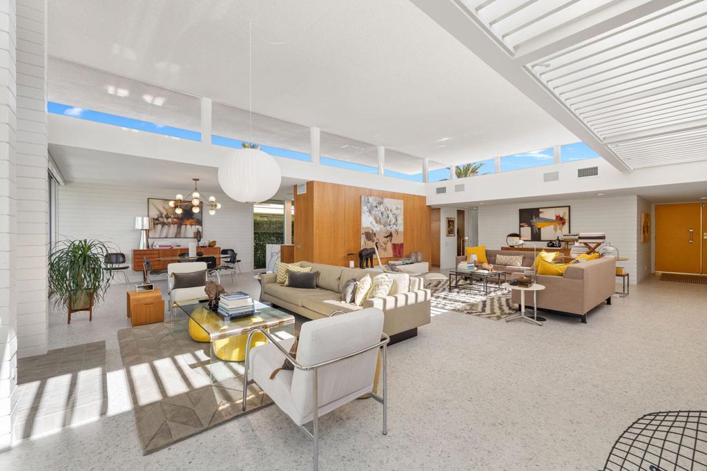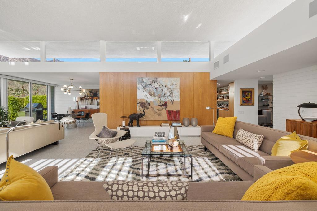 Set within the iconic Kings Point mid-century modern community of just 44 residences, designed by renowned architect William Krisel, homes in this exclusive South Palm Springs enclave are rarely available. Stunning and timeless, this home was completely remodeled and thoughtfully reimagined in 2024. It showcases iconic mid-century lines, high ceilings with clerestory windows, and seamless indoor-outdoor flow. The open-concept great room features walls of glass framing stunning mountain views, while the chef’s kitchen boasts white oak cabinetry, quartz countertops, and premium appliances. The spacious primary suite offers a private retreat with direct patio access, a spa-like bathroom, and dressing room with custom wood cabinetry. Two additional en-suite bedrooms provide flexibility for guests or media space. Designed for entertaining, the home opens to a private patio with fire pit, BBQ, and inviting lounge area. Additional highlights include designer drapes, remote-control shades, Sonos sound system, custom fireplace, new flooring, 240v car outlet, and tankless water heater. Residents also enjoy tennis courts and two pools and spas, just steps away. Every detail of this home has been elevated, making this Krisel gem both architecturally significant and move-in ready.