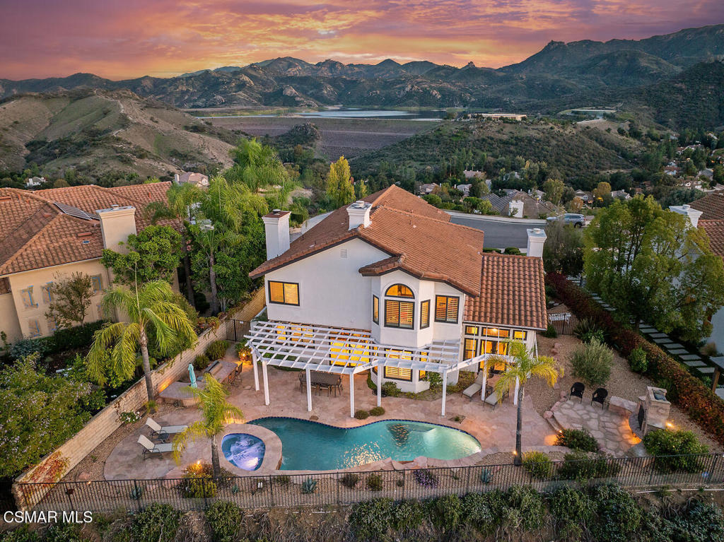WOW! Commanding location at the TOP of Three Springs. Rarely Available Location! Endless skies. Forever Views in every direction. Serene setting. Privacy. Set on the top of a flat cul-de-sac in Westlake Village, with no one across the street, no one behind you. Sweeping reservoir water views out the front, and gorgeous mountain/sunset views out the back. Sparkling pool & spa. Outdoor fireplace, BBQ station, covered patio, and natural landscapes in a very private setting. Numerous updates over the past few years. Popular floor plan features 3,127 sq ft with 4 bedrooms, a primary retreat, 3 full bathrooms, and a huge bonus room perfect for home office or bedroom 5. Step into high ceilings, fresh white walls, rich woods, and earth tones throughout. Gorgeous Ash wood floors, stone tiles, and travertine throughout. New windows, new doors, new Bosch dual zone HVAC system. Rich wood kitchen cabinets, new Cafe’ appliances, and granite counters with plenty of room to host and entertain. Relax out back and enjoy the sunset views by the pool. Upstairs the primary suite has gorgeous updates, a cozy fireplace, and a pretty copper soaking tub that takes in the views. The Bonus Room has unobstructed views out towards the reservoir. New exterior paint, 3 car garage, gorgeous hardscapes, and a deep driveway. This is a rarely available location, and a perfect place for your forever home to live the Southern California lifestyle. Hurry on this one!