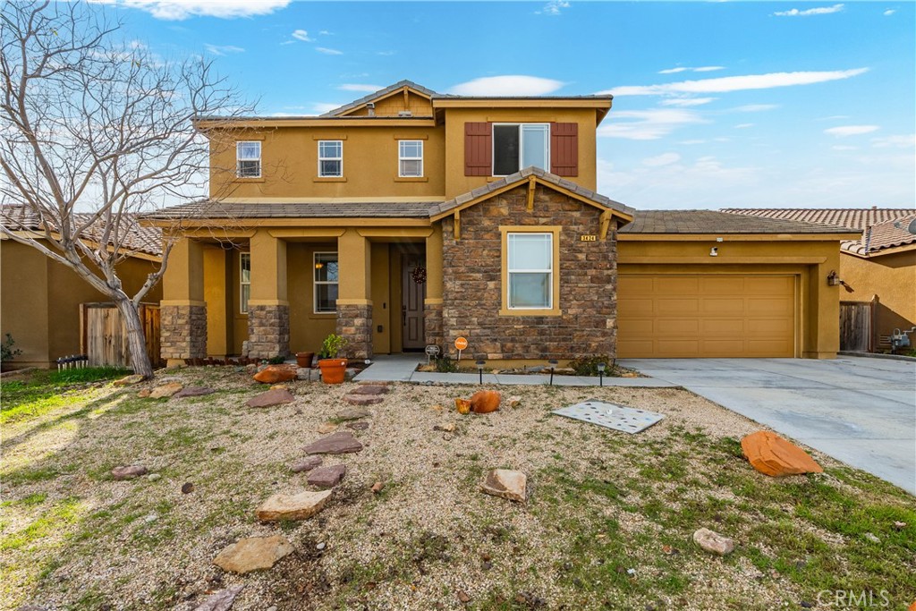 Step into this beautifully designed 5-bedroom, plus office, 3-bath home offering pre-paid solar lease (no payments owed) and a tandem 3-car garage. Perfectly blending space and functionality. The main level includes a bedroom and full bathroom, ideal for guests or extended family, along with a private front office featuring double-door entry. The heart of the home is the open and airy kitchen, complete with a center island, stainless steel appliances, walk-in pantry, and abundant counter space, all overlooking the expansive family room with soaring ceilings. A formal dining area provides the perfect setting for gatherings and special occasions. Upstairs, the primary suite offers a true retreat with a spacious walk-in closet and an en-suite bathroom featuring dual sinks, a large vanity, soaking tub, and separate shower. Three additional oversized bedrooms share a thoughtfully designed hall bathroom with dual sinks and a separate tub/shower area. Tandem 3 car garage offers a Tesla charging system. While rear yard is ample in size for all of your needs. With multiple living spaces, energy efficiency, and room to grow, this home checks all the boxes