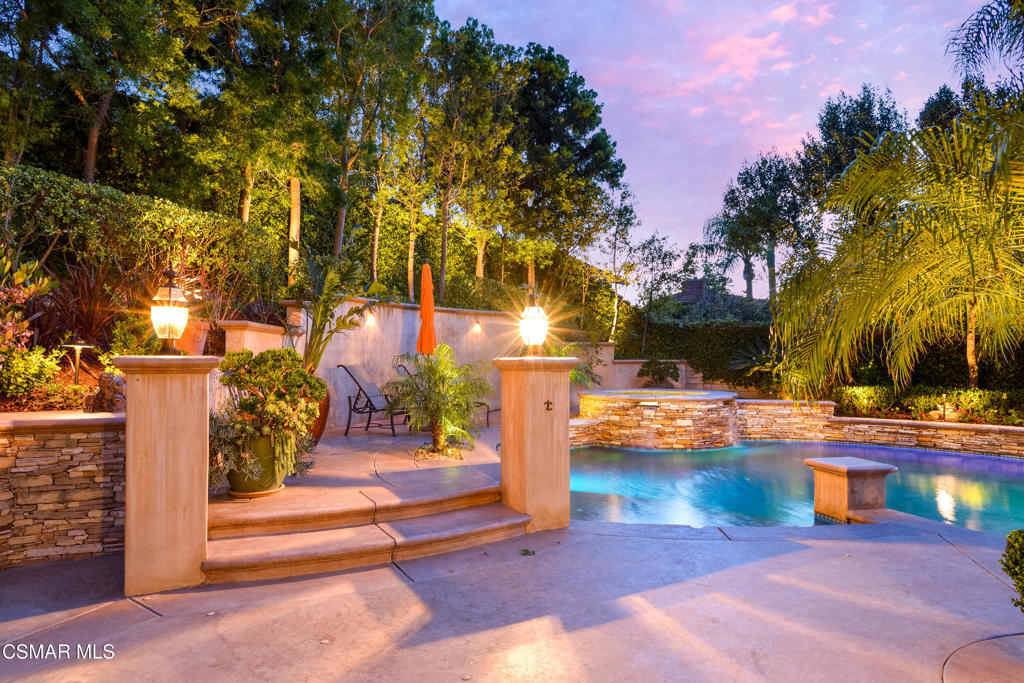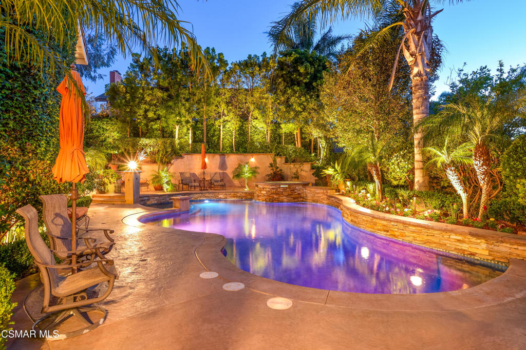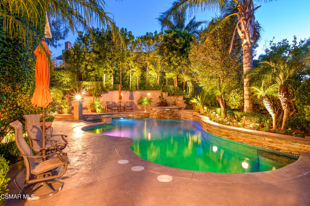 Welcome to this stunning, upgraded home located at the end of a quiet cul-de-sac, offering a unique & spacious entertainer’s yard! With great curb appeal, this property boasts a private backyard oasis complete with a large Pebble Tec pool & spa featuring swim jets, stacked stone, a beach entry, and a built-in BBQ. The yard also offers stamped concrete with flagstone accents, a tranquil waterfall, and a generous grass area–perfect for both relaxation and entertainment.Inside, the home features 4 spacious bedrooms upstairs, including a large master suite with a cozy sitting room/office area. A downstairs room with French doors can serve as a 5th bedroom. This property is filled with high-end upgrades, such as custom teak wood front doors with a transom window, a new roof (installed in 2021), dual-pane windows and sliders, LED recessed lighting, a solar system, and a Ring security system. The home also features beautiful laminate flooring on both levels, 8 ceiling fans, 3 fireplaces, vaulted ceilings, a new dual-zone HVAC system, closet organizers, and a custom wrought iron staircase.The kitchen is a true showstopper, with remodeled white cabinetry, pull-out shelves, stainless steel appliances, a Dacor built-in refrigerator, a large island with an attached wood butcher block extension, stone countertops, and open to family room with fireplace. The master suite offers vaulted ceilings, a sitting area with a fireplace, a private balcony, a walk-in closet with custom organizers, and pull-down attic storage. The en-suite bath features dual sinks, a shower with dual showerheads, and a separate soaking tub for ultimate relaxation.The 3-car garage includes built-in cabinetry, an epoxy floor, and a 220V outlet for an electric car charger with direct access. The home’s open floor plan features soaring ceilings in the entry, living room, and main bedroom, creating a light and airy feel. The living room flows seamlessly into the formal dining area, and the large gourmet kitchen opens into the family room.A remodeled downstairs bath includes plumbing for an additional shower, should the new owner wish to add one.This home is truly a gem and must be seen to be fully appreciated!