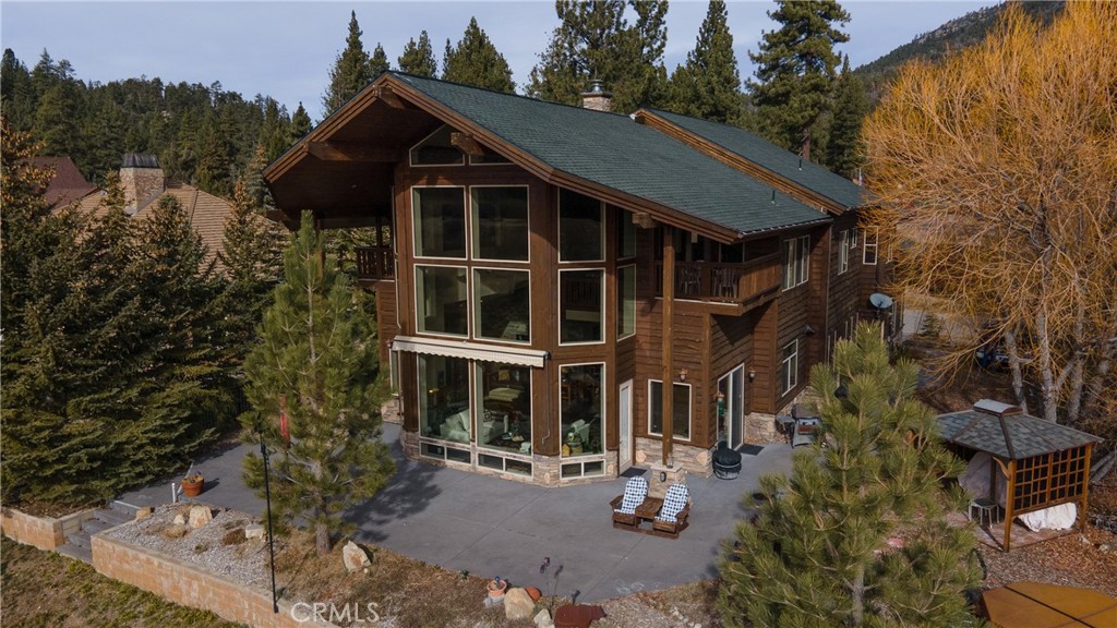 An extraordinary lakefront offering with an unmatched 394 feet of Big Bear Lake frontage, showcasing sweeping, views of the lake and San Bernardino Mountains. This 5-bedroom, 4.5-bath, 3,908 sq ft estate delivers true mountain luxury, exceptional privacy, and scale rarely found on the lake. The dramatic Great Room features soaring 30-foot ceilings, floor-to-ceiling windows, refined slate flooring, and automated electric window shades that perfectly frame the lake beyond. Throughout the home, custom alder wainscoting—unlike anything you’ve ever seen—adds warmth, craftsmanship, and architectural distinction. Three wood-burning fireplaces with gas starters enhance the mountain-lodge ambiance. Designed for effortless entertaining, the chef’s kitchen showcases custom alder cabinetry, an oversized professional refrigerator/freezer, dual ovens (gas and electric), and a butler’s pantry with dumbwaiter. A built-in wine cabinet accommodates 320+ bottles, ideal for hosting and long-term storage. The home offers two spacious primary suites, including a ground-floor primary with a jacuzzi tub, plus an upper-level primary retreat. Additional bedrooms and the game room feature plush carpeting, while living areas maintain elegant slate finishes. The expansive game room includes a pool table, shuffleboard, and game table. Outdoor living is exceptional with three balconies, a gazebo, outdoor jacuzzi, and retractable sun shade, ideal for enjoying Big Bear’s four-season lifestyle. Additional features include a heated driveway, oversized 2-car garage, indoor laundry, hidden 22’ x 15’ storage room with expansion potential, 26 solar panels, two gas furnaces plus one electric furnace, and an impressive portico entry. Situated on an 11,674 sq ft homesite plus an adjacent 20,629 sq ft lot with a private water well, this is a truly rare Big Bear Lake legacy property offering unmatched frontage, flexibility, and long-term value.