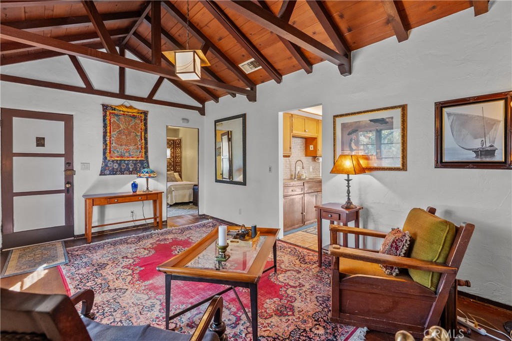 Tucked away from the street and situated amongst perfectly placed plants, glorious trees and pathways to delightful seating areas, this is the one you have been looking for! Highly coveted Crescenta Highlands neighborhood presents this one of a kind home that blends the warmth and character of it’s 1932 era with comfortable updates that make the home truly special. Step inside to find gorgeous wood beamed ceilings, decorative fireplace, original hardwood floors in the living room and front bedroom, classic details and plenty of natural lighting! The inviting kitchen combines charm and functionality with its classic tile counter tops and coordinating backsplash. Featuring newer modern appliances and a spacious eat in area. A built in buffet adds extra storage and serving space, blending style with practicality. Just off the kitchen connects seamlessly with the family room, offering easy access to both your back and side yard. Upstairs, the spacious primary retreat offers a private sanctuary complete with a cozy fireplace, walk in closet, wood beamed ceilings, ceiling fan and an en-suite with dual sinks and serene views. Step out onto your private balcony to enjoy morning coffee or relax and get lost in your favorite book, this is the place to be! The yard is sophisticated, warm and inviting at the same time. The garage has been converted to storage area or whatever your imagination has, complete with french doors. Upgrades include: 2022 New AC and Heat, 2020 New electric, Insulation, Ducting, Rain Gutters, 2 new clean outs, concrete pavers and crushed marble gravel, EQ retrofit under house, 2020 interior and exterior paint (cool life paint – cools home in Summer) 2024 new appliances, and so much more! Located next to parks, hiking, shopping, dining, transportation and freeway access. This home has so much love and is waiting for a new owner to call it home. Let your story begin here, chapter one……..