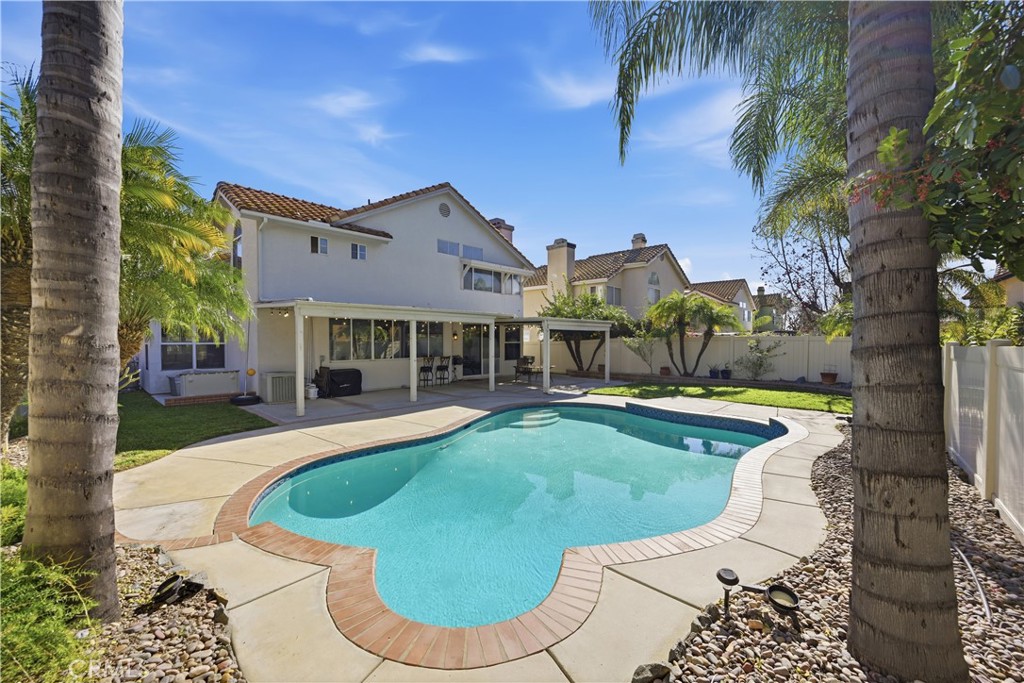 This 4-bedroom, 2.5-bath home offers 2,722 sq ft of living space, a private pool, and no HOA, creating a comfortable setting for both daily living and entertaining. Inside, the formal living room and separate dining room provide welcoming spaces for gatherings. The back of the home features a spacious family room with a fireplace that opens to the kitchen, allowing for an easy, connected flow. The kitchen offers generous counter space, a large window overlooking the backyard, and a pass-through counter to the covered patio. All four bedrooms are located upstairs, including a well-sized primary suite with dual sinks, a soaking tub, and a separate shower. The backyard includes a covered paved patio and pool, ideal for relaxing or hosting guests. Notable upgrades include vinyl plank flooring, fresh interior paint, new vinyl fencing, a new pool pump, new attic insulation, and fully paid solar with a new inverter. A 3-car garage adds functionality. Conveniently located minutes from the I-15 freeway, shopping, and dining, this home offers space, comfort, and accessibility.