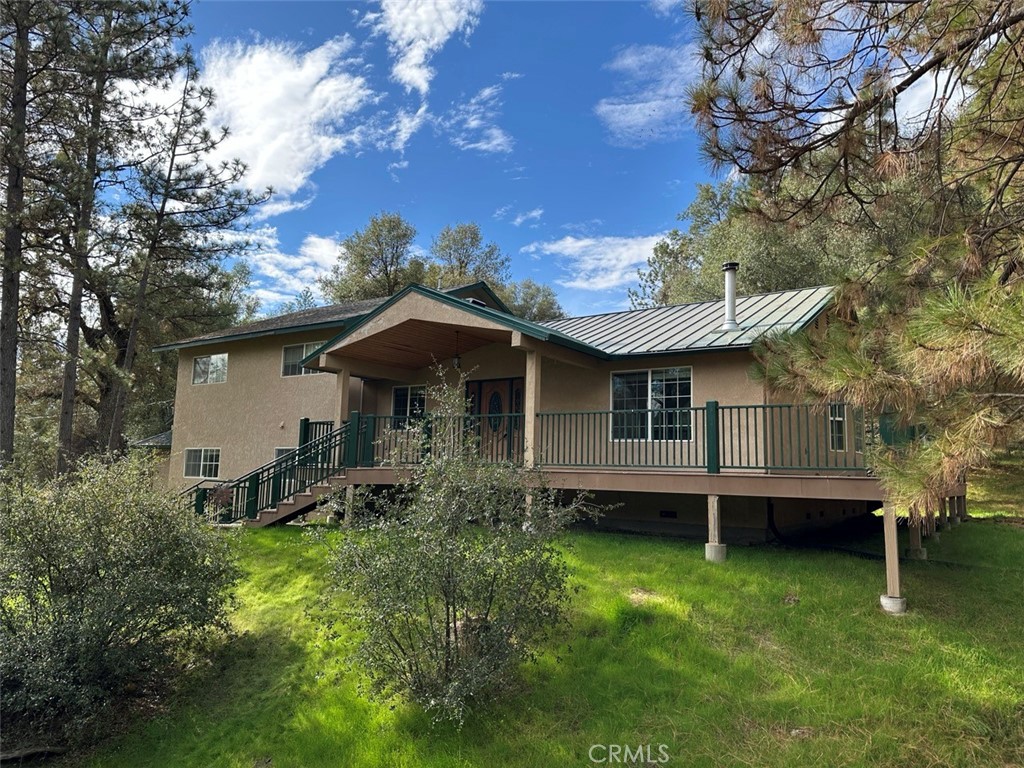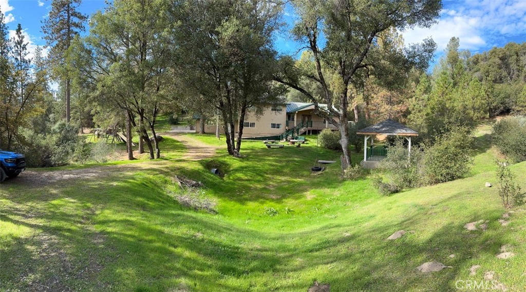 5 BEDROOM Family Home Priced To Sell…Check out this BEAUTY! This quality-built five-bedroom, three-bath tri-level home offers comfort, privacy, and the peaceful charm of a seasonal creek complemented by its own gazebo. Tucked among mature native trees, this setting provides true tranquility while still being conveniently located between Mariposa and Oakhurst—just 12 minutes from downtown Mariposa. Inside, the spacious great room welcomes you with a vaulted knotty pine ceiling and cozy wood stove. The adjoining dining area, finished with beautifully engineered hardwood flooring, opens to a Trex deck—perfect for morning coffee, reading, or simply enjoying the surrounding nature. The upper level (only five steps up) includes a nice-sized primary bedroom, two comfortable guest bedrooms, and a full guest bath. Just seven steps below the main level, you’ll find a generous family/entertainment room featuring a built-in TV, plus two additional guest bedrooms, a full bath with a large walk-in shower, and direct access to the spacious concrete patio ideal for barbecues and outdoor gatherings. This lower level has its own heating system and connects directly to the attached two-car garage. The spacious kitchen includes stainless steel appliances, wood cabinetry, and tile flooring. A circular driveway enhances convenience and accessibility. Peaceful, private, and full of character, this lovely property offers a wonderful place to start the new year. Shown by appointment only—come see all this home has to offer!