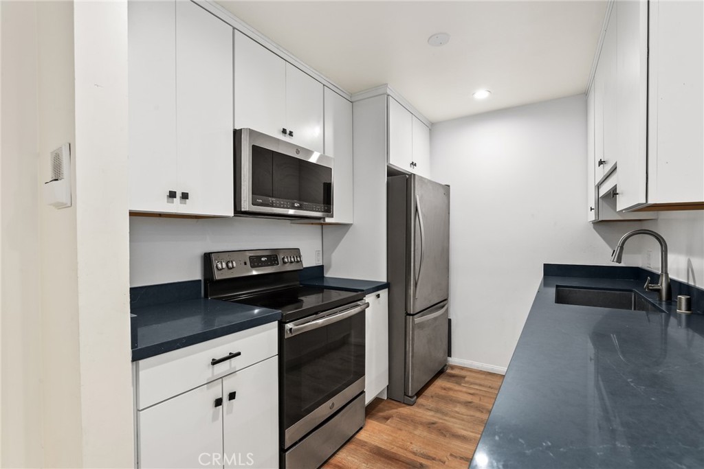 Proud to present this beautifully updated 2 bedroom, 2 bathroom, 1,116 sq ft condo in the highly sought-after Raintree community in Culver City. Thoughtfully renovated with over $80,000 in upgrades in recent years, the home features smooth ceilings, recessed lighting, and engineered wood flooring that elevate the modern appeal. The stylish kitchen is appointed with quartz countertops, a farmhouse sink, stainless steel refrigerator and dishwasher, and an electric stovetop—perfect for everyday cooking and entertaining. The open-concept living room includes a decorative fireplace and flows seamlessly to the extended balcony, surrounded by lush trees and natural light for a peaceful indoor-outdoor experience. Ideal for privacy, the two bedrooms are located on opposite ends of the unit, each with direct balcony access and its own en suite bathroom. The primary suite offers soft carpeting, two sliding-door closets, and a beautifully remodeled bathroom featuring penny tile, modern finishes, and a glass-enclosed shower. The secondary bedroom hosts a walk in closet and adjacent newly tiled bathroom with shower and deep tub. Additional highlights include central heat and air and two assigned parking spaces. HOA includes water, trash, sewer, gas, basic cable and internet. Resort-style living awaits at Raintree, where residents enjoy a wealth of amenities: a heated pool, hot tub, clubhouse, fitness center, scenic walking paths, a large tranquil lake, 24-hour gated security, and even a volleyball court. All of this in the heart of Culver City, just moments from Downtown Culver City, Sony Studios, Baldwin Hills Scenic Overlook, Westfield Mall, countless shops, restaurants, and short distance to two high-ranking elementary schools (Farragut & Linwood E. Howe), Culver City Middle school and Culver City high school.