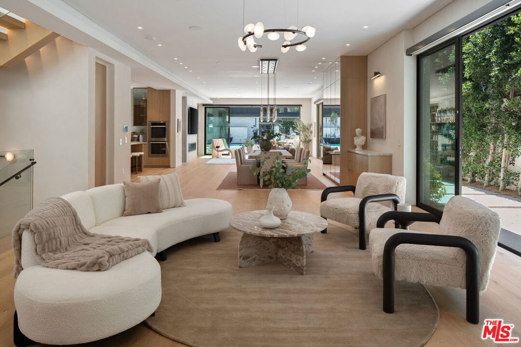 Set behind a canopy of mature olive trees that lend both shade and privacy, this newly built architectural residence spans approximately 7,700 square feet across two levels and a full basement. The main level unfolds with dramatic scale, offering expansive living, dining, and family rooms anchored by a sleek fireplace and framed by soaring floor-to-ceiling windows that flood the interiors with natural light. A flexible office or guest suite with an adjoining three-quarter bath enhances the layout. The gourmet kitchen is a statement in design, appointed with bespoke DOCA cabinetry, quartz countertops, a professional 6-burner cooktop with hood, Miele double ovens, wine refrigerator, beverage center, microwave, and a generous sized pantry. Upstairs, three spacious en-suite bedrooms include a tranquil primary suite featuring a fireplace, private balcony, custom oversized closet, dual sinks, freestanding soaking tub, and a luxurious rain shower. A serene hallway patio and a second laundry room add both style and convenience. The lower level is dedicated to leisure and wellness, boasting a state-of-the-art theater, fitness studio, wet bar, sauna, steam shower, bedroom with en-suite bath, custom built-ins, and a refined fireplace. Outdoors, the resort-style backyard is designed for entertaining with a sparkling pool and spa, barbecue island, mini-fridge, and a two-car garage. A private junior ADU suite offers further versatility with a kitchenette, stacked washer/dryer, three-quarter bath, balcony, and dramatic floor-to-ceiling windows. Additional highlights include wide-plank hardwood and stone flooring throughout, elevator access to all levels, and a fully integrated Crestron smart home system. Located on one of Santa Monica s most desirable streets, just moments from Palisades Park, the beach, fine dining, and luxury shopping.