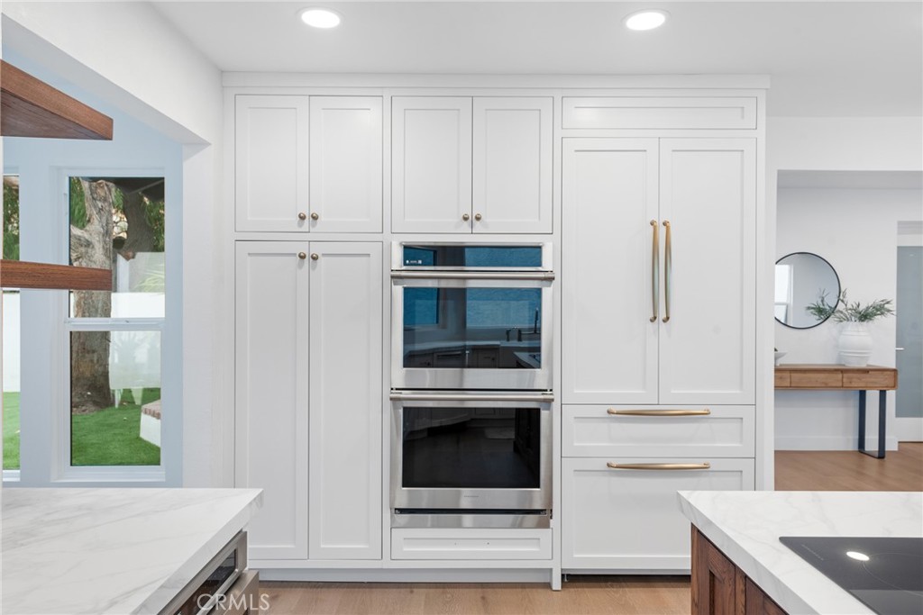 Showcasing ocean and mountain views in the highly sought-after Mariners Point community of Southeast San Clemente, this stunning fully remodeled coastal residence offers designer finishes and a layout designed around the views. From the moment you step inside, the home is intentionally oriented to maximize light and indoor-outdoor flow—framing Catalina sunsets and ocean breezes. VAULTED CEILINGS in every bedroom and living room create volume, light, and architectural drama. New bespoke cabinetry spans the kitchen, closets, bathrooms, and laundry area, blending warm white oak elements with a crisp contemporary aesthetic. The chef’s kitchen features a custom-stained oak island with floating shelves, cabinetry painted in Benjamin Moore Dove White, a Sydney Harbour plaster backsplash in the color Rubble, and a full suite of MONOGRAM luxury appliances including a fully integrated French-door bottom freezer refrigerator, induction cooktop, and built-in double oven. KD Arabescatto White Satin countertops continue through the kitchen and bathrooms for a cohesive elevated finish. New Vandyck Progettista hardwood floors run through the main living spaces, enhancing the modern coastal flow and open-concept design. Wide bifold doors connect the main living areas to the outdoors, creating a seamless transition for entertaining and view enjoyment. Lighting has been curated throughout, including custom kitchen sconces by MikeLightingStudio (Etsy), dining lighting from Lulu and Georgia, statement staircase alabaster chandeliers from Arhaus, plus hand-painted beams with custom finishes from Vista Paints and track lighting in the living room and study. Each bathroom has been reimagined with designer tile selections including Celine, Sahara White, Shoji White, and honed basketweave detailing for a spa-inspired feel; the primary bath features a 66” freestanding solid surface stone resin tub, Delta Cassidy Champagne Bronze faucets, and premium lighting from Rejuvenation. Exterior upgrades include smooth Glacier White stucco, a steel garage door by Unique Garage Doors, new front entry hardware, and exterior fixtures from Troy Lighting, plus a newly paved and landscaped courtyard, custom decking, glass railings for unobstructed sightlines, and exterior deck/courtyard lighting that brings the outdoor experience to life at night. A rare opportunity to own a magazine-worthy coastal retreat with ocean views in one of San Clemente’s most coveted coastal enclaves.