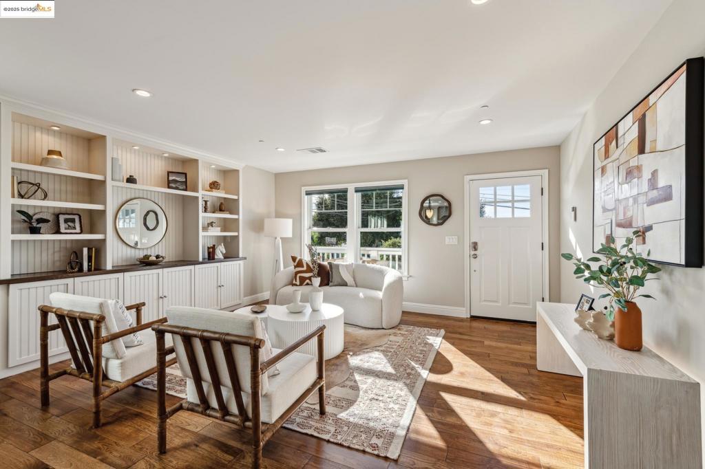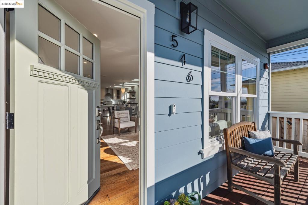 Welcome to this meticulously maintained Cape-Cod style home, offering stunning views of the Golden Gate Bridge & Bay. Built in 2014, this 2,076 sq.ft. beauty blends timeless design w/ modern amenities. The open-concept layout boasts custom finishes throughout, including sleek engineered hardwood floors refinished in 2025. The chef’s kitchen features marble countertops, detailed cabinetry, & stainless steel appliances. The expansive primary bedroom includes a private balcony w/ panoramic views. The spa-like primary bathroom offers a soaking tub, large stall shower, double vanity, & marble floors. With 3 bedrooms, 3 bathrooms, & dual-pane Anderson windows, this home ensures comfort & efficiency. Modern systems include owned solar, a tankless water heater, & energy-efficient 2-Zone HVAC system with A/C. Outside, enjoy a freshly landscaped front yard, a stained Merbau hardwood porch, and a stamped Connecticut Blue Stone backyard w/ drought-resistant plants. A 2-car tandem garage, plus ample off-street parking, adds convenience. Additional upgrades include 200 AMP electrical service, SimpliSafe security, & sewer lateral compliance. Close to BART, EC Plaza, restaurants & theatre, don’t miss the chance to see this sophisticated home w/ unmatched views and an ideal location.