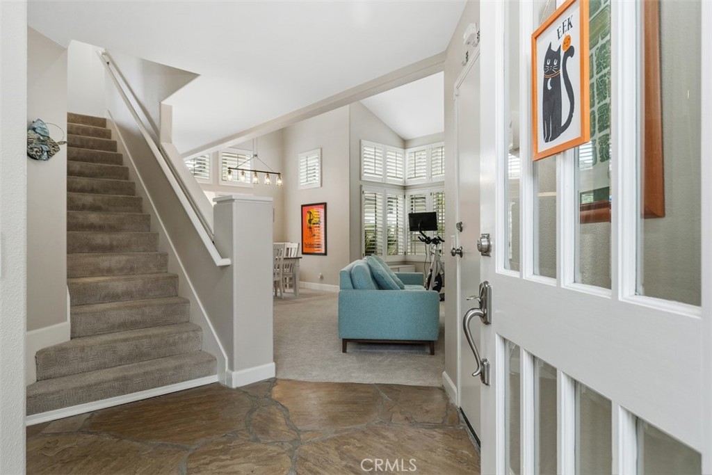 This turnkey two-story townhome offers 3 bedrooms, 2.5 bathrooms, a family room and private rear yard. Soaring cathedral ceilings and expansive windows flood the home with natural light, creating a bright and inviting atmosphere. The spacious great room is perfect for entertaining, while the cozy family room with fireplace invites relaxation. The kitchen boasts white cabinetry, granite countertops, a new stainless-steel refrigerator, and a cheerful breakfast nook. Upstairs, the primary suite offers plenty of light with a view balcony and a newly remodeled bathroom featuring a walk-in shower, spa tub, and white cabinetry. The two additional bedrooms, a full bath and laundry area complete the upper level. Additional upgrades include newly re-piped PEX plumbing, a new water heater, whole house water filtration system, wood shutters, and slate stone flooring downstairs. Step outside to your private entertainer’s patio—an oasis framed by mature palms and greenery. The nearby community pool and spa add to the resort-like experience. Low tax rate and NO MELLO-ROOS! Located just under 3 miles from stunning beaches and close to hiking trails, parks, and everyday amenities—this home truly has it all. Don’t miss your chance to live where luxury meets location!