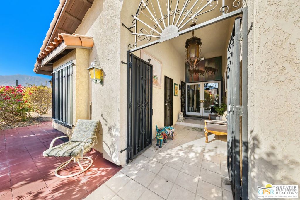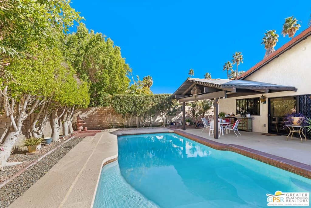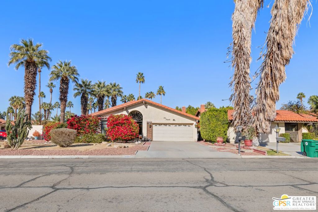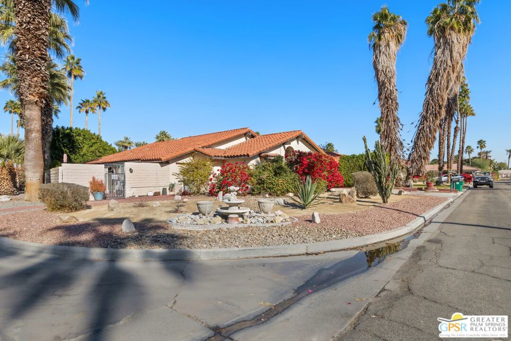 Cathedral City’s best kept secret! Located in a small development of 53 homes. Not gated, No HOA’s and on FEE LAND. Centrally located between Palm Springs and Palm Desert. Home is on a corner lot. Open floor plan. As you enter the front door, there is a living room off to the right with a gas fire place, and formal dining room. Straight ahead is the family room and Kitchen with a breakfast bar and granite counter tops. 3 bedrooms (all with a bathroom adjacent.), 3rd bedroom with 3/4 bath and adjoining office/den. Back yard is very private with block walls, built in swimming pool and spa. Patio is covered. Storage units on side of yard. Desert Landscaping! Priced to sell!