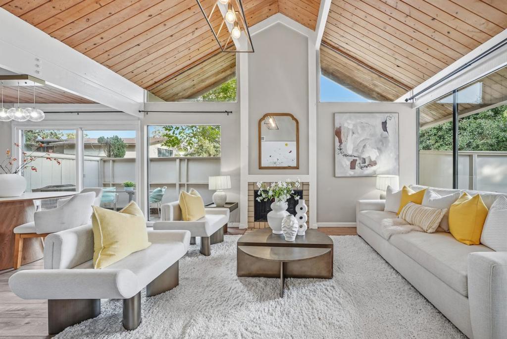 Stunning 2b/2b SINGLE STORY END-UNIT Townhome w/ private YARD and TOP-RATED SCHOOLS in the Center of Silicon Valley! This modern Mid-Century Retreat style designed for effortless living. Feel like a single family home with no one above or below you. Open floor plan. Main living area features striking vaulted ceilings creating a bright, spacious, airy feel. Floor-to-ceiling windows w/ large sliders that open directly to the private yards, providing seamless indoor and outdoor enjoyment for relaxing or entertaining. Dining area w/ modern light. Newly remodeled chefs kitchen w/ modern cabinetries and s/s appliances. Thoughtfully updated bathrooms w/ contemporary finishes. Primary bedroom has an en-suite bath, huge walk-in closet, vaulted ceilings, expansive glass and sliding door connected to the beautiful yard. Hard floor throughout. Central Heating & AC. Private yard w/ extra storage and new landscaping. Enjoy the community pool, spa, clubhouse, sauna, and tree-studded landscape. Top rated schools- Cumberland Elementary (very SHORT WALK), Sunnyvale Middle, Homestead High. SUPER CONVENIENT LOCATION: Easy access to El Camino Real, Central Expy, and Hwys, etc. Minutes to major tech companies! Close to parks, groceries, cinema, restaurants, coffee & teas, Sunnyvale downtown, etc.