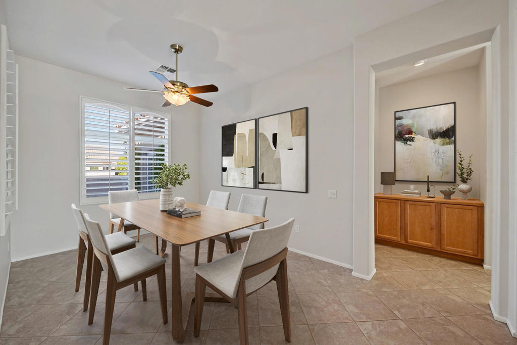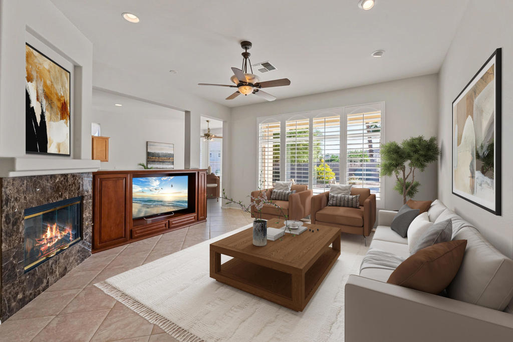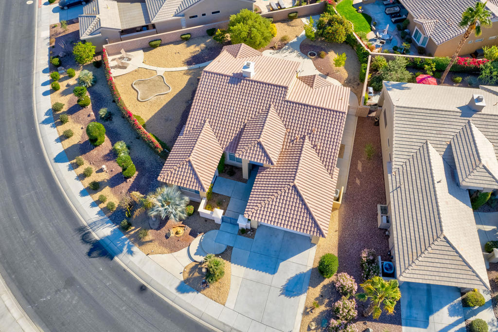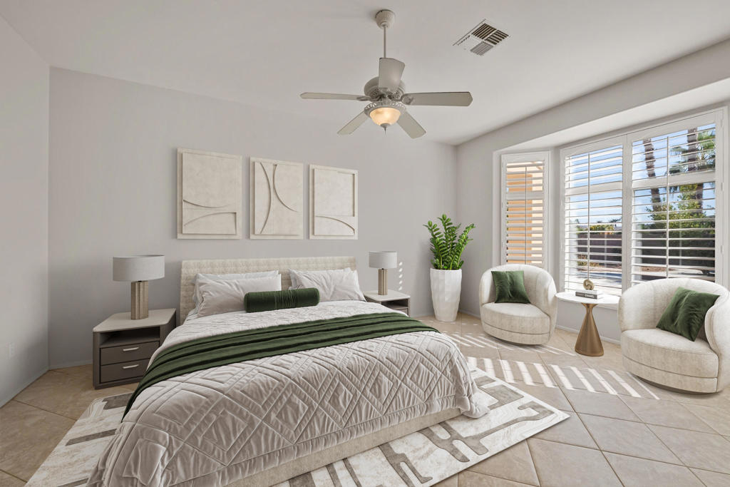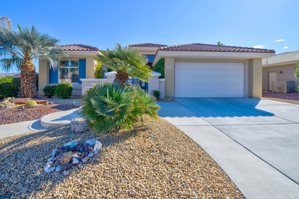 Sun City Palm Desert 55+ Rare Expanded Tangier model on an Oversized lot is Move-in ready! Open floor plan with high ceilings, Tile floors and Plantation Shutters through-out. Enter to the great room with fireplace and built-in media center that opens to the kitchen with single level corian countertops, raised wood panel cabinet doors, canned lighting and new stainless refrigerator adjoins an extended kitchen nook with bay windows and sliding doors leading to a large patio. The popular split floor plan has a large primary suite with bay windows, private bath with dual vanities, large step-in shower and walk-in closet. Opposing side of the home is the extra large guest bedroom with its own private french doors that lead to a beautiful courtyard. Guest bath with tub/shower combo and marble surround. Newer Rheem HVAC approx 4 years. The garage is extended and has a golf cart niche’ and is lined with storage cabinets. Amazing oversized backyard has extensive hardscape, sun decks and meandering pathways with fruit trees. Located in the new section on a quiet street near the Lakeview Clubhouse.