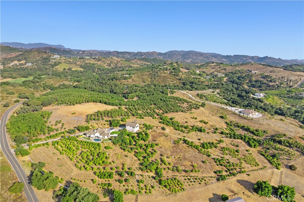 PRICE REDUCTION. This property is located on almost 10 acres in the desirable De Luz community with a 3963 sq.ft. main house plus a 1400 sq.ft. detached guest house. Both homes have amazing views and breathtaking sunsets including views of the local Cross Creek golf course. Other features include a swimming pool and spa, an organic avocado and citrus grove, family orchard, a huge RV garage and a great location with an easy drive to town. The custom built main home has 12ft. high ceilings in the entry with 10ft. ceilings throughout. Features throughout the main house includes wood flooring, custom quality crown molding,built in cabinets and was specifically designed to enjoy the views from almost every room providing lots of natural light throughout. The well designed kitchen includes a large island, granite countertops, newer appliances including double ovens and a sub zero refrigerator plus lots of cabinetry and storage and a walk in pantry. The comfortable family room features a custom built fireplace encased by built in cabinets on either side. The huge private master suite overlooks and opens to the landscaped fenced backyard and pool and spa area. There is a lovely separate formal living room and dining room plus an office with built in cabinets and book shelves. The 4th bedroom with an en suite bathroom is upstairs. Other features include a new water filtration system, newer AC units plus central vac system. The guest house was built in 2006. It features a living room, totally self contained kitchen, two bedrooms plus a full bathroom. It also has an outdoor enclosed living area with surrounding glass windows where you can enjoy amazing views and breathtaking sunsets.It has its own laundry facilities located downstairs in the 40×30 ft. RV garage that also has a workshop area and attic storage. The certified organic grove includes many newer trees including avocados, Kara Kara oranges, pink lemons, and pixi tangerines with almost 5 acres of land to plant a vineyard or add to the grove. Also enjoy a family orchard and vegetable garden including table grapes, lemons, berries, apples, peaches, plums, nectarines, pears, red and sweet onions and tomatoes. The property is completely fenced with a custom gate. A leased solar system for both homes. The main home has a 3 car garage plus there is lots of parking space. This property offers a great lifestyle and location close to the city of Temecula Old town and Wine Country to also enjoy.