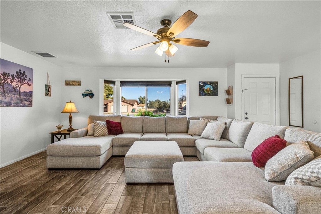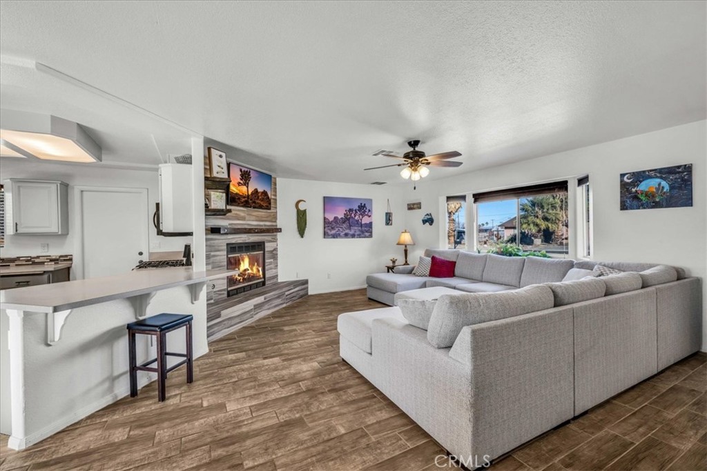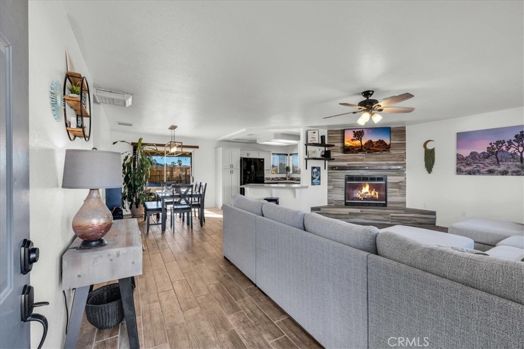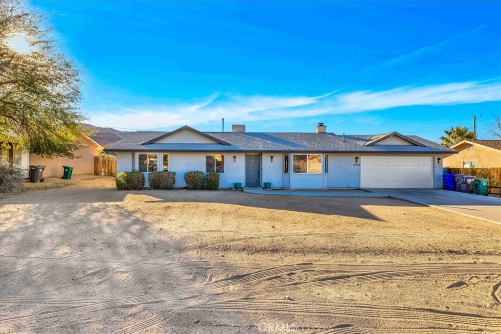 Welcome to 6964 Estrella Ave, a beautiful 3 bedroom, 2 bath home located in a quiet and desirable neighborhood with STUNNING mountain views. Featuring 1,346 sqft of living space, this home’s modern style & functional floor-plan is one to be desired. As you step inside the spacious open-concept living room you’ll find beautiful wood-like tile flooring, a lovely gas/wood-burning fireplace and a large east facing window that lets in an abundance of natural light. Just off the living room is the formal dining space & kitchen which is complete with ample cabinet/counter space, nice appliances, bar seating and a picture window above the sink to take in those gorgeous mountain views. All bedrooms feature ceiling fans, new plush carpet and the primary bathroom shower has been beautifully updated. Not to mention, this home has an attached 2 car garage, a newer roofer (less than 5yrs old), dual cooling (central AC & an Evap cooling) and leased solar to keep cost low year round (buyer to assume solar lease). Outside you’ll be delighted to find a fully fenced yard with wood privacy fencing, a lovely covered patio with string lighting and plenty of space to entertain or relax around a firepit on a starry desert night. Come take a look & let this home’s light, bright & charming allure do the rest. Your new desert home or weekend retreat awaits!